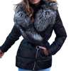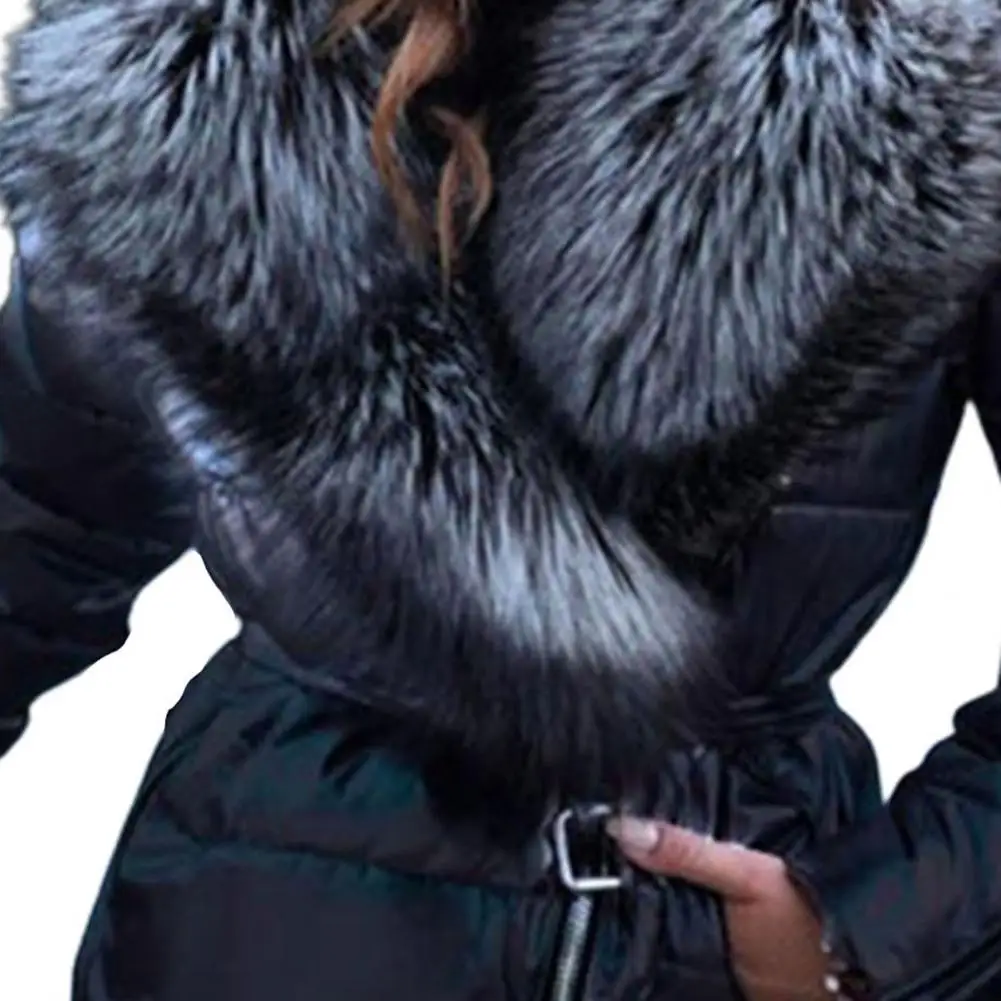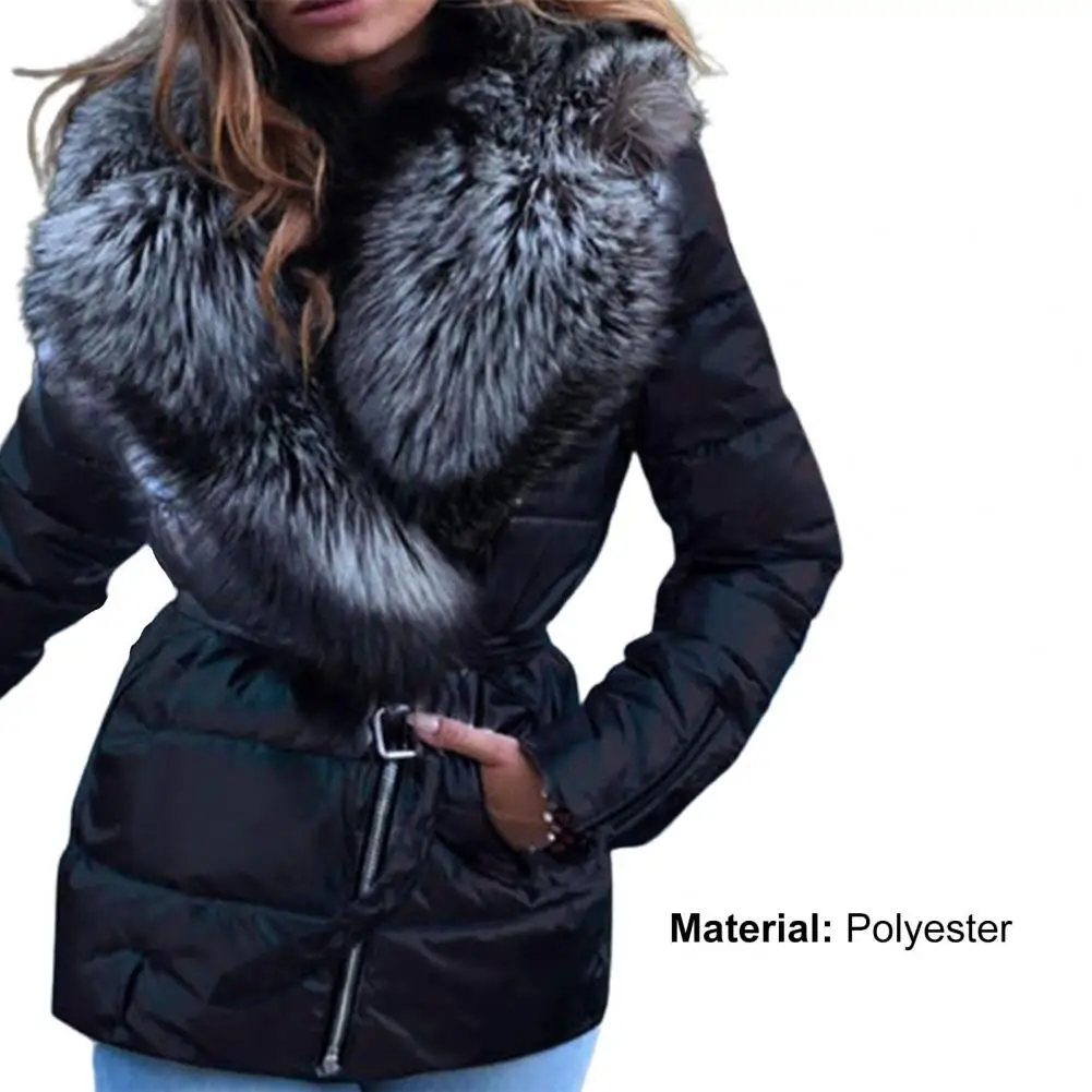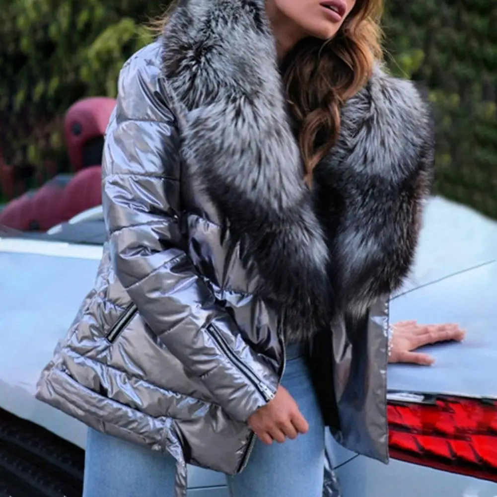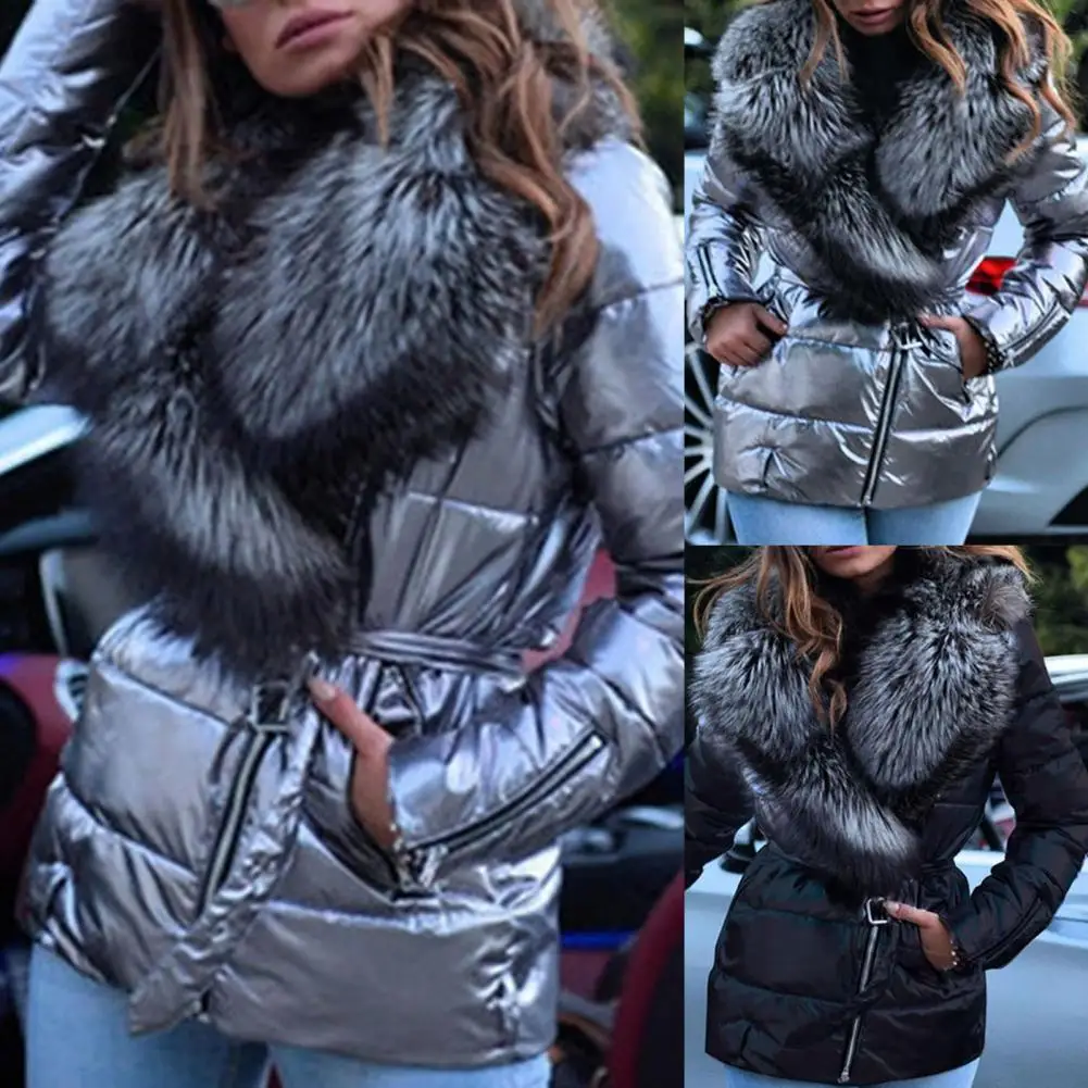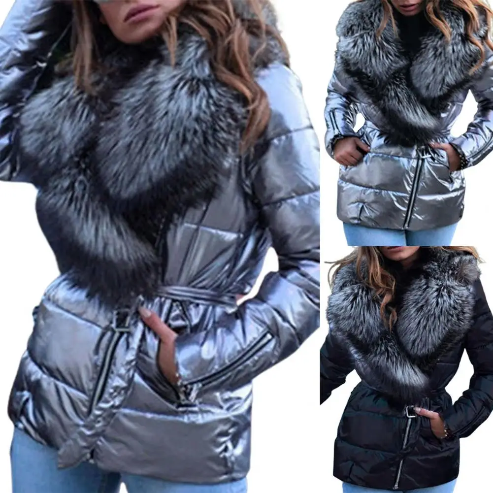 Slash Zipper Belt Bright Surface Women Jacket Winter Women Faux Fur Collar Puffer Jacket for Fall Winter