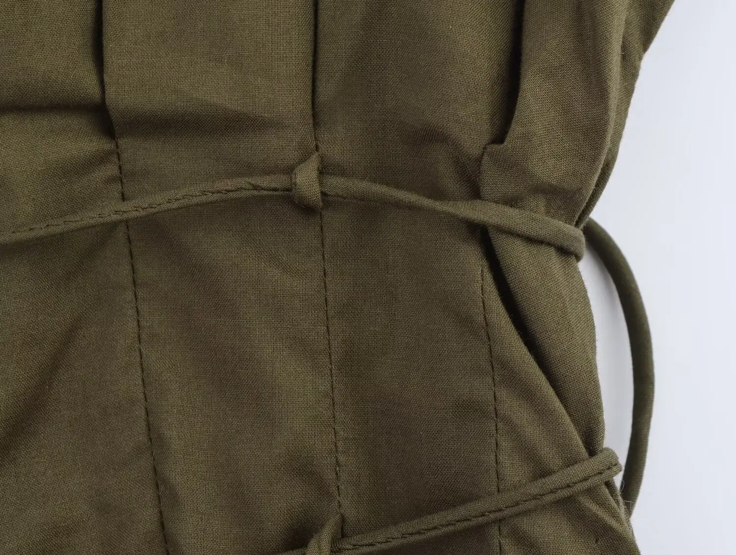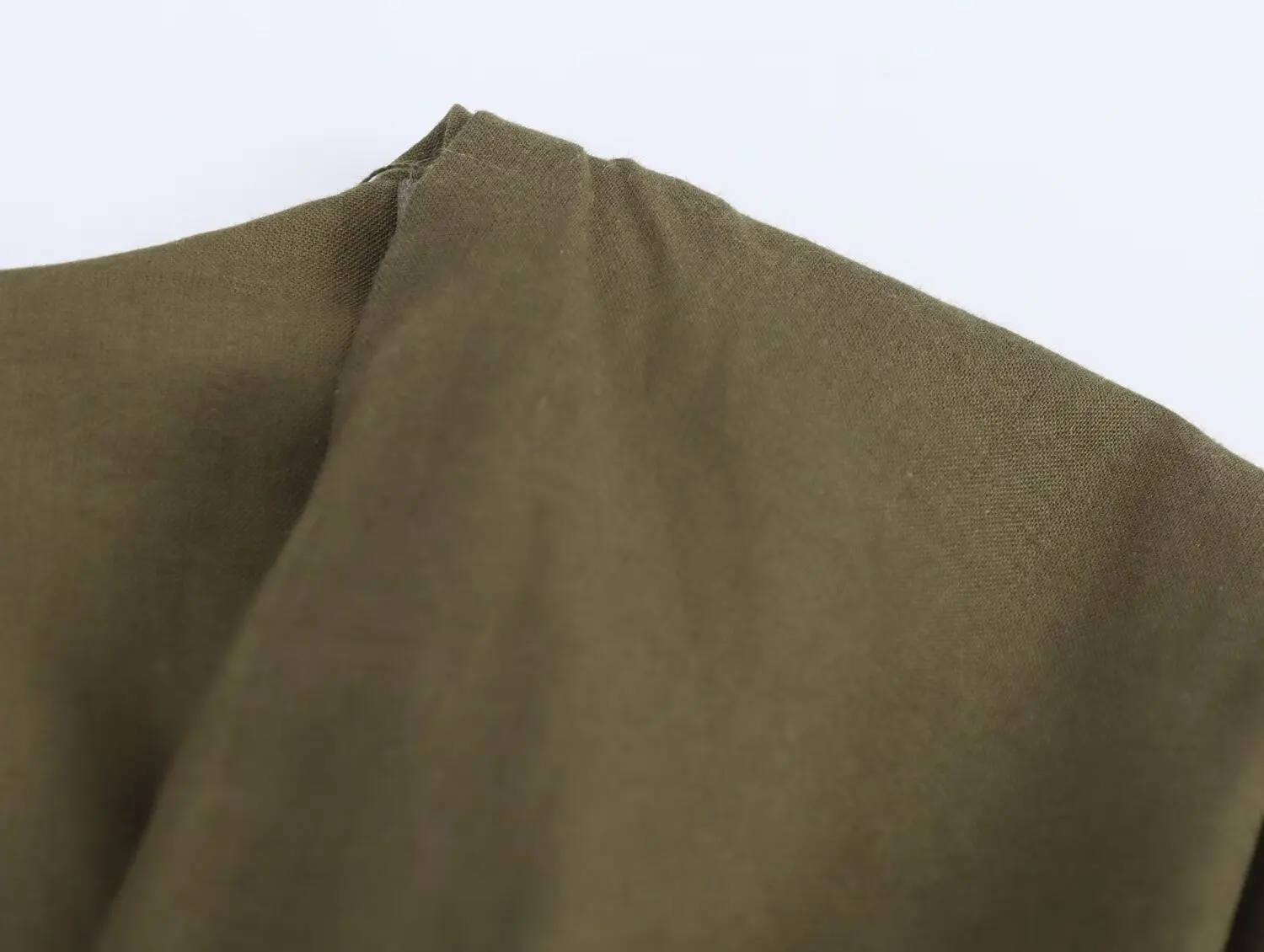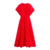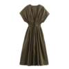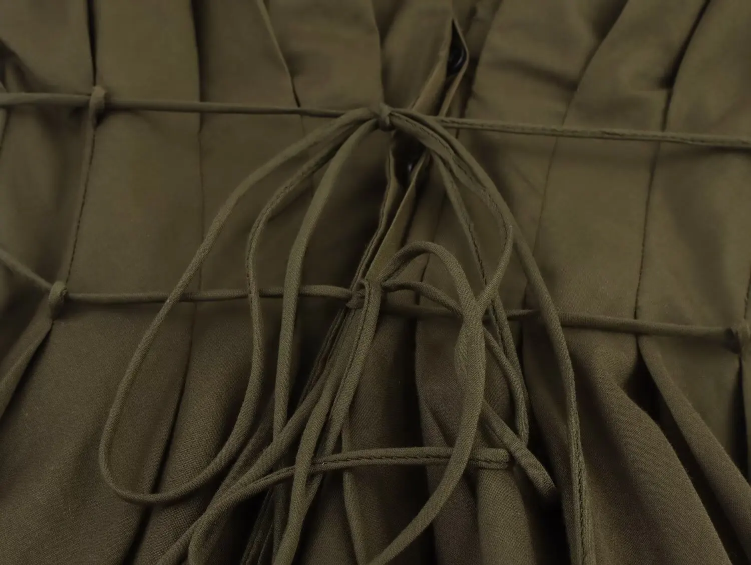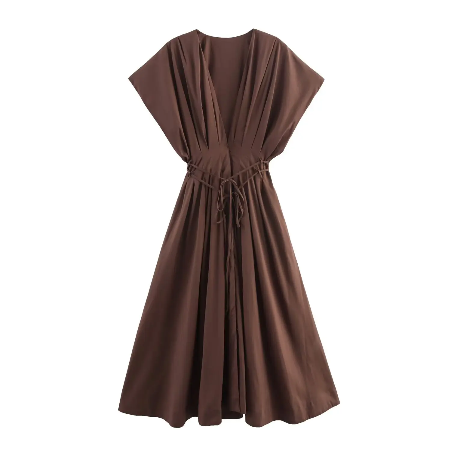 TRAF vacation style women’s clothing 2025 autumn pleated MIDI V-neck hanging shoulder short sleeved lace up dress long skirt