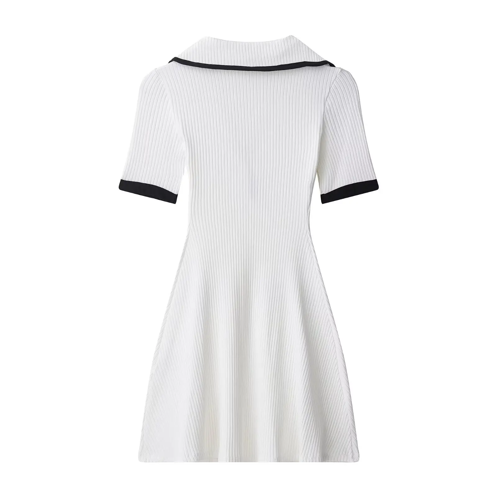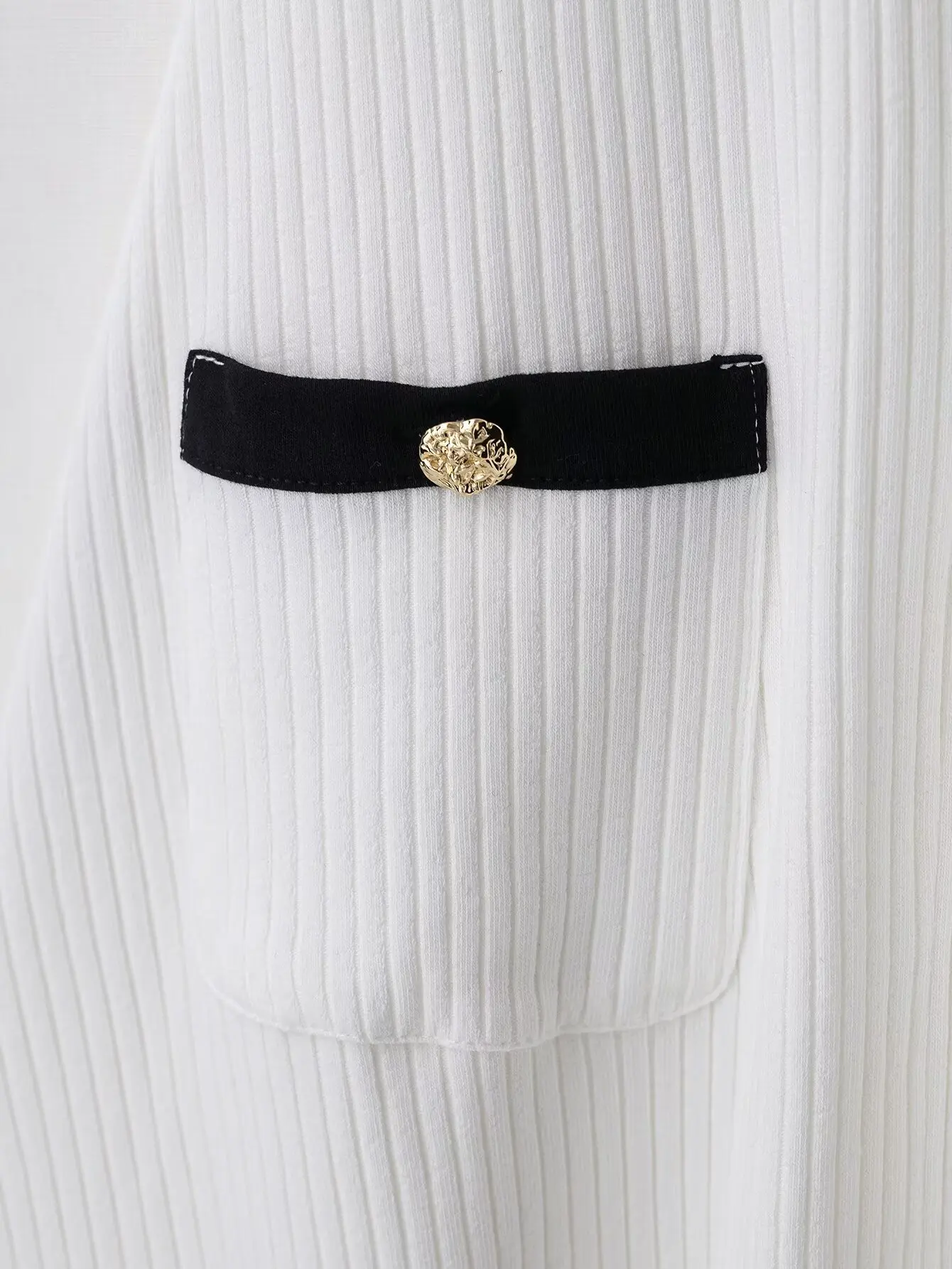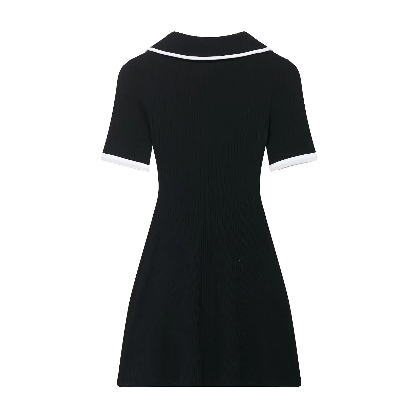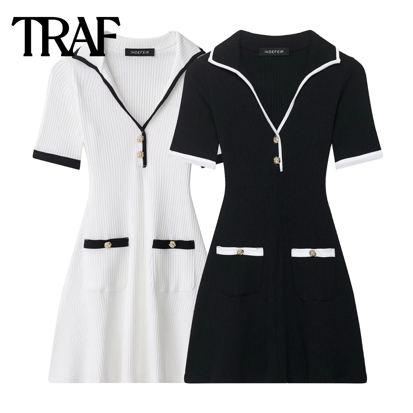TRAF women’s slim fit V-neck autumn new style 2025 short skirt cinched waist metal button ribbed dress college style