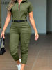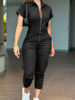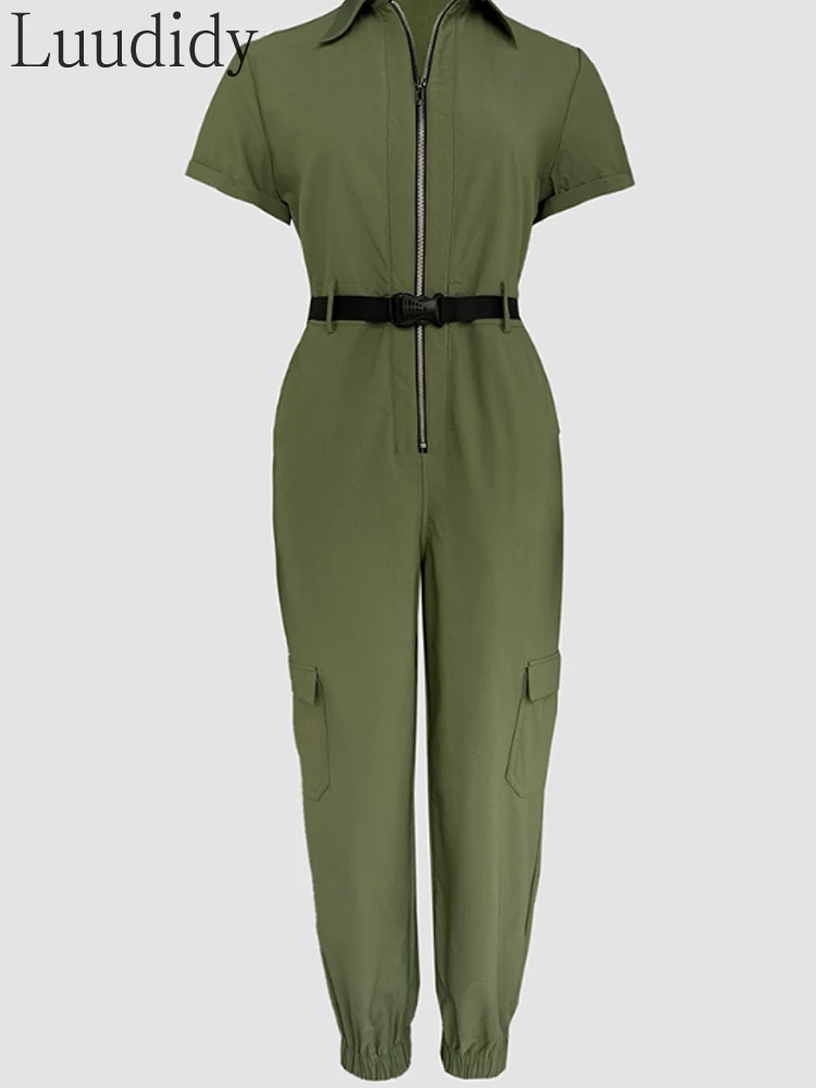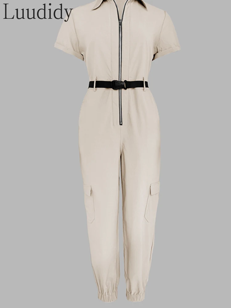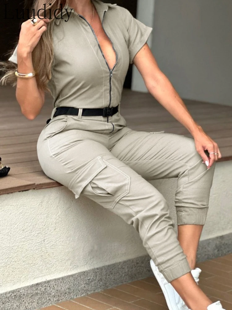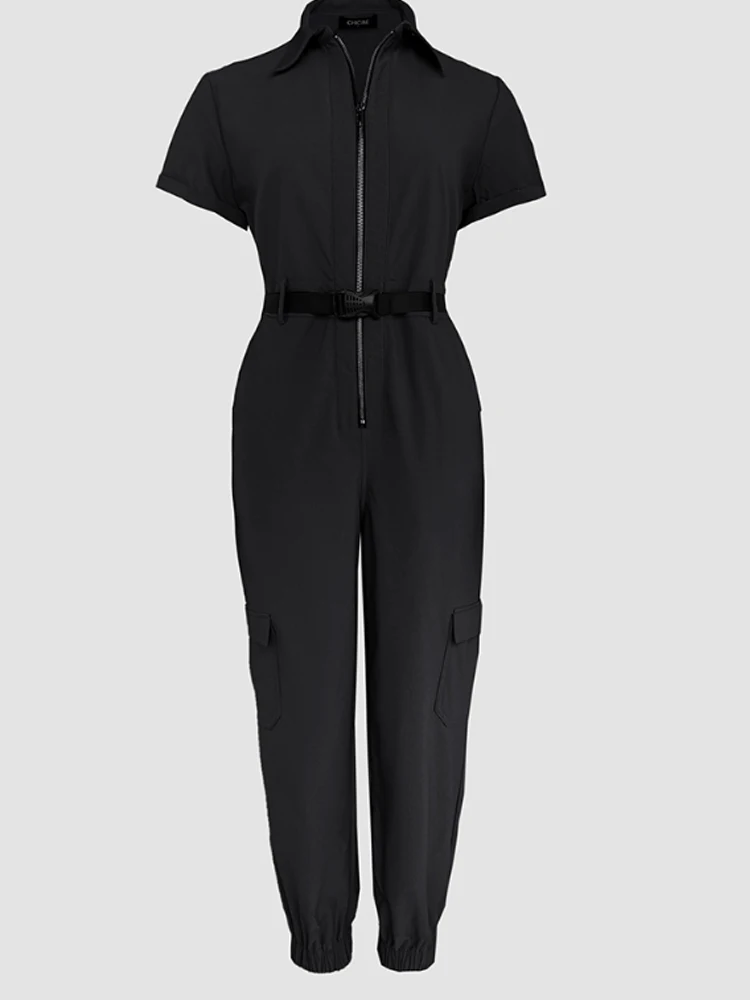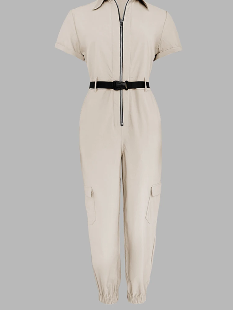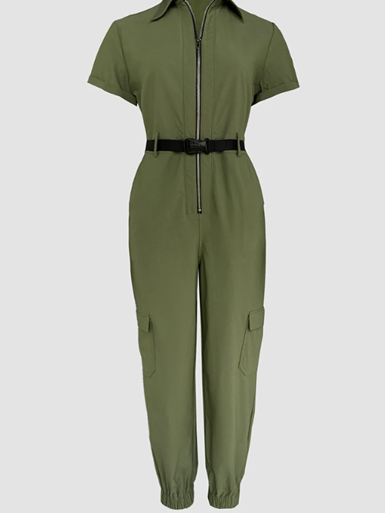 Turn-down Collar Short Sleeve Zipper Front Cuffed Jumpsuit Casual Pocket Design Cargo Romper With Belt