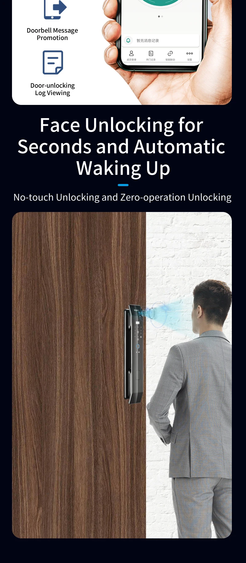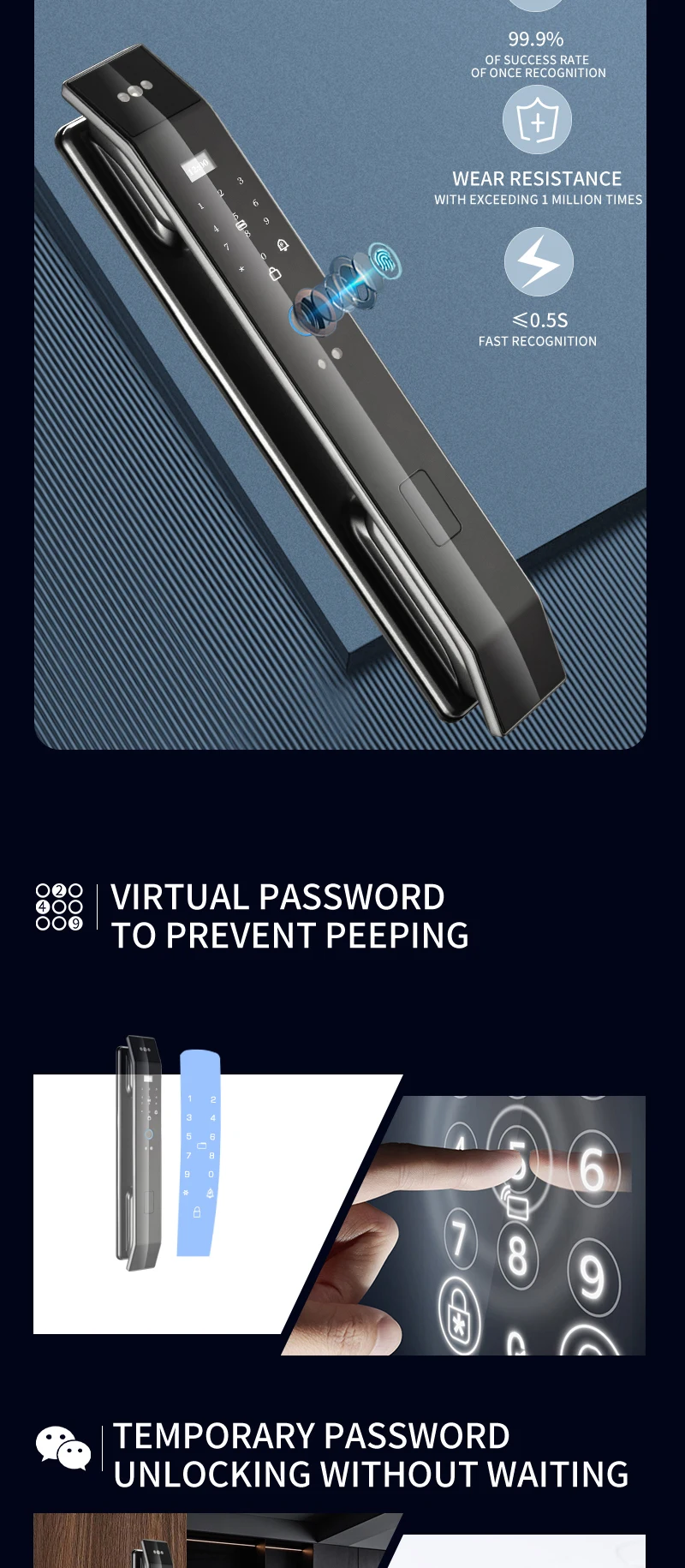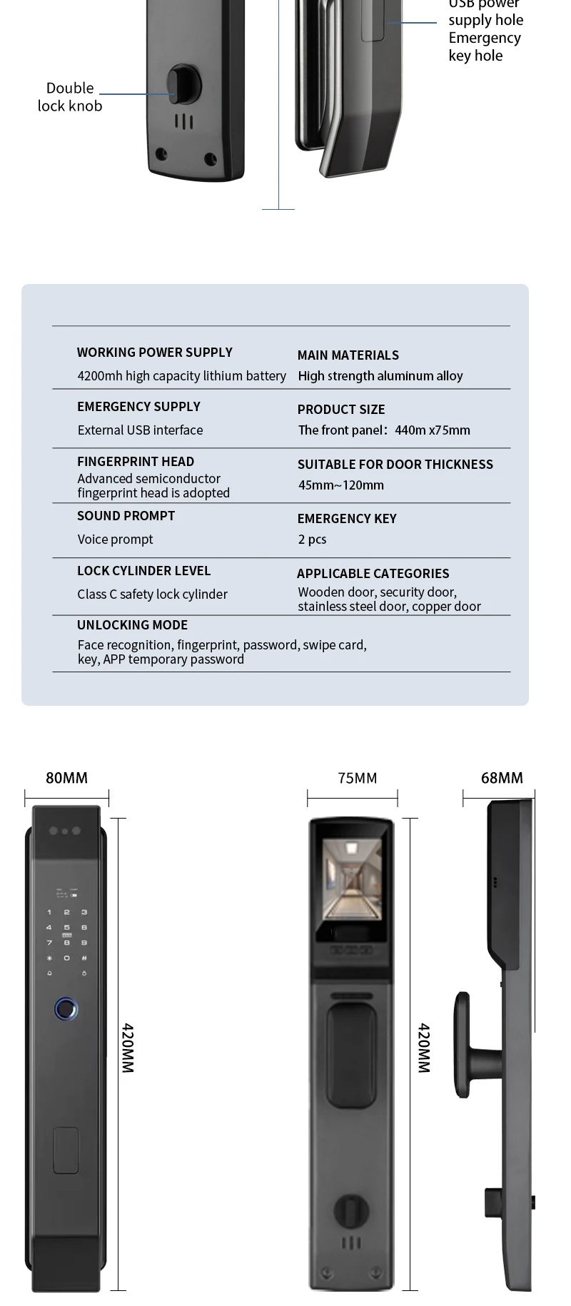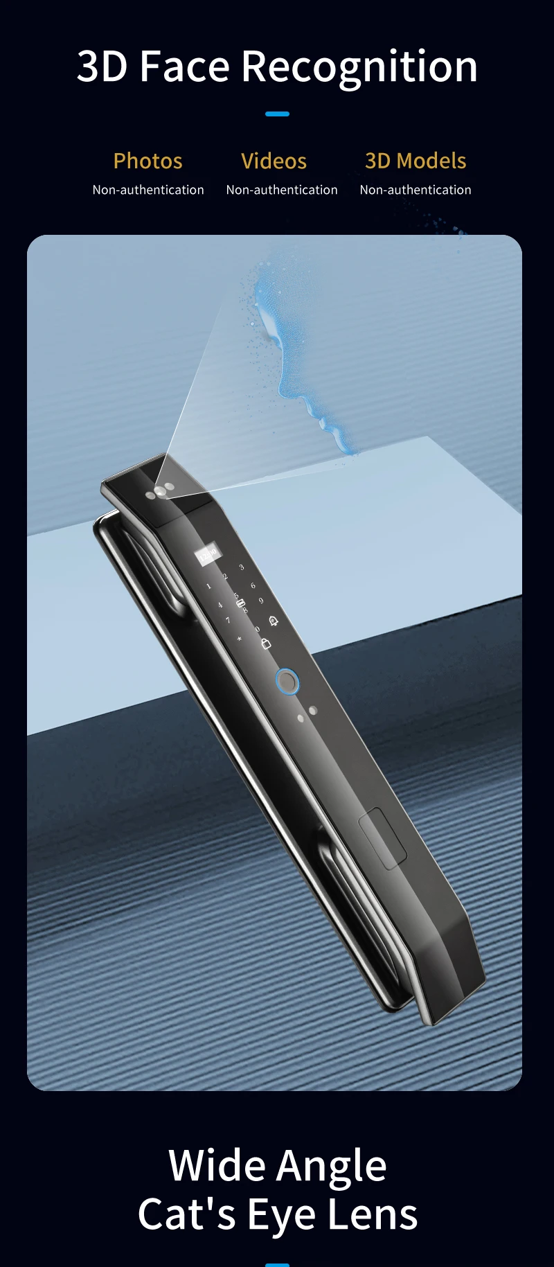 1. 6 unlock ways: 3D infraed Face,Fingerprint, Password, IC Card, Mechanical Key ,APP(Real-time Intercom)