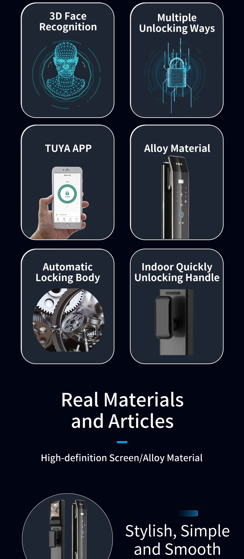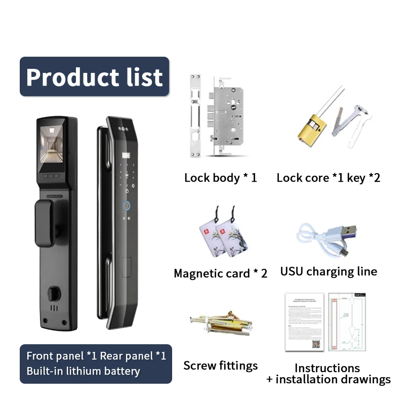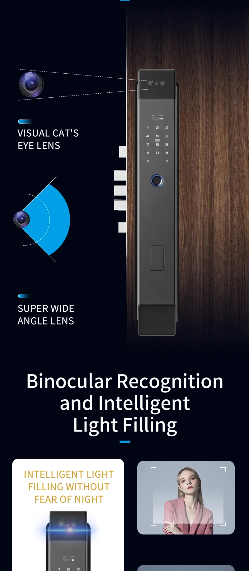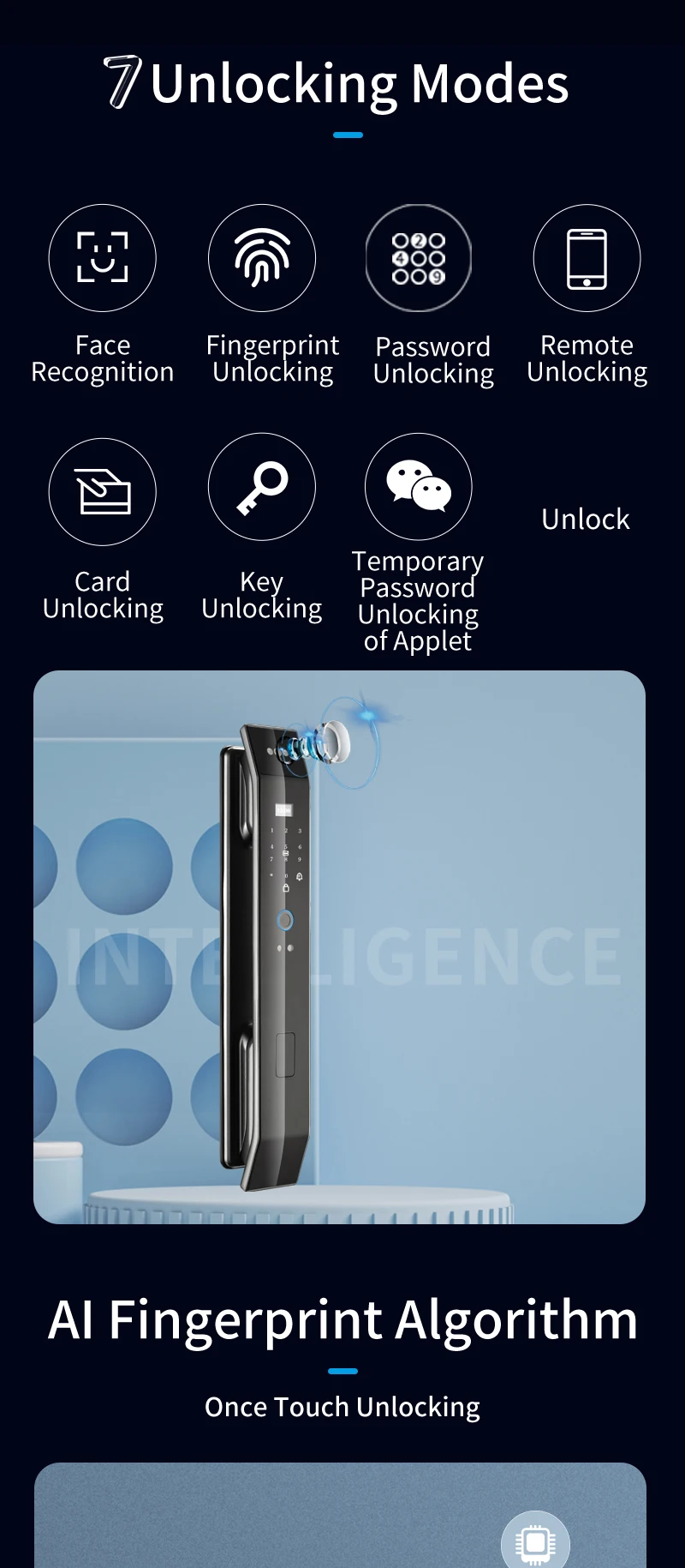 1. 6 unlock ways: 3D infraed Face,Fingerprint, Password, IC Card, Mechanical Key ,APP(Real-time Intercom)
