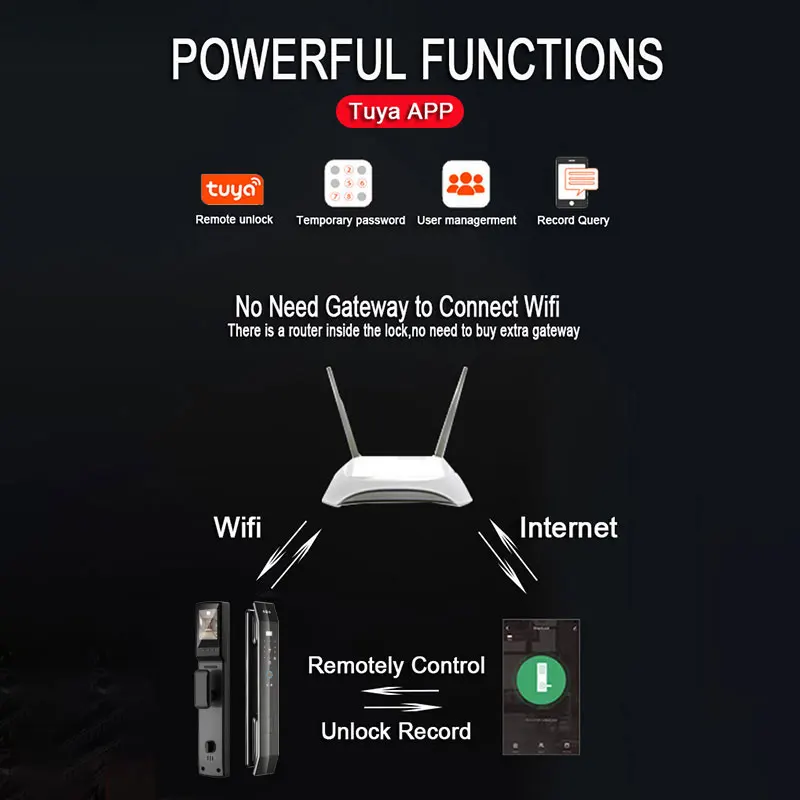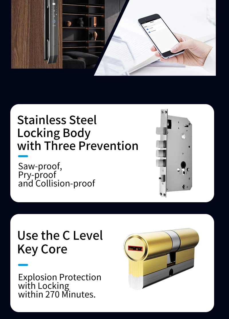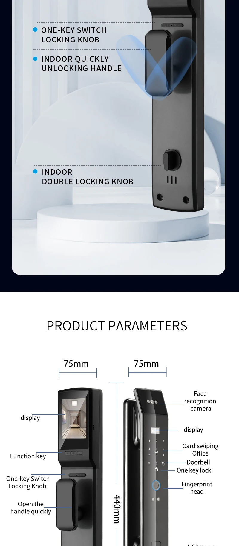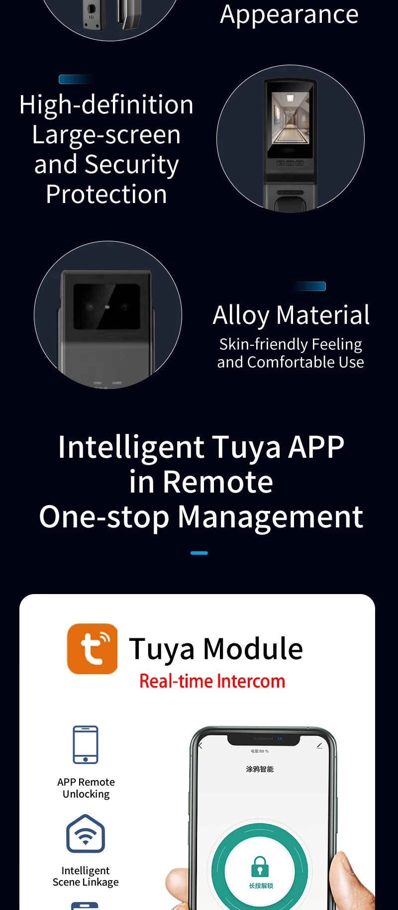 1. 6 unlock ways: 3D infraed Face,Fingerprint, Password, IC Card, Mechanical Key ,APP(Real-time Intercom)