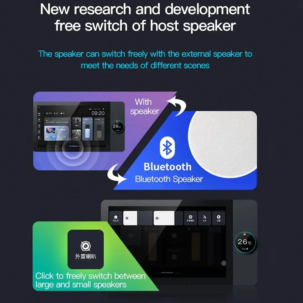 2W Speaker:The host comes with 2W speaker, which can be used for waking up, answering, and scene linkage playback. And the host with a high-power amplifier, can be connected to 2-20W four speakers, to meet the need to listen to music customers, in their own speakers, Bluetooth speakers, comes with a high-power amplifier free choice.