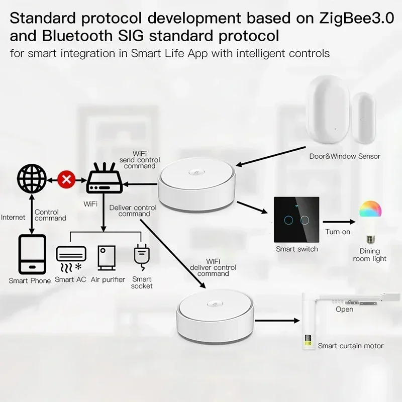 Control sub-devices of the gateway, supporting remote control and group control for connected Bluetooth-Compatible and ZigBee smart devices in Smart Life App as multi-protocol communication ,ensuring stable control of 128 devices as strong performance.