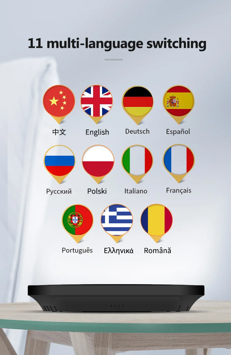 This alarm system support 11 language to switch : English / Russian / Spanish / German / Polish / Chinese / Italian / French / Portuguese / Greek / Romanian.