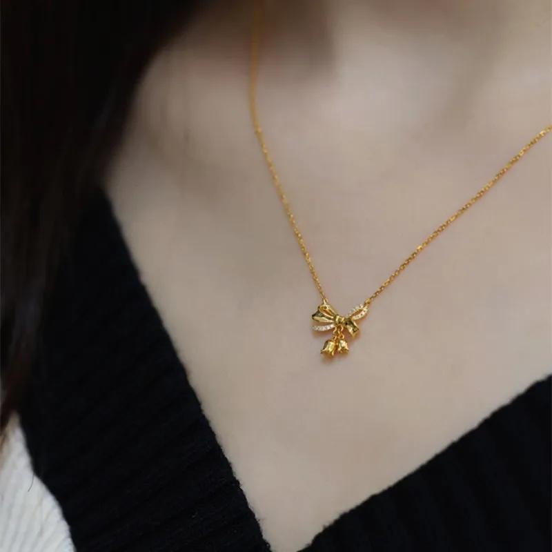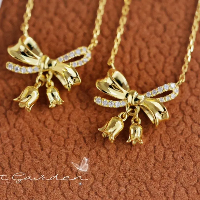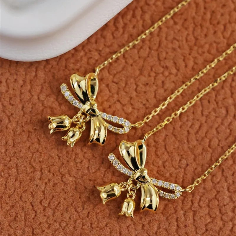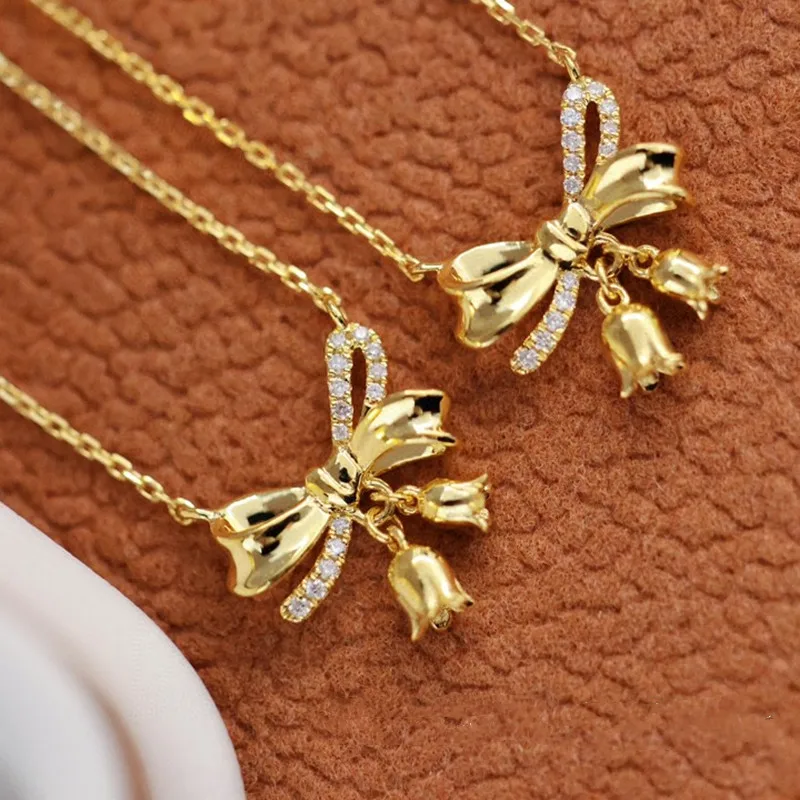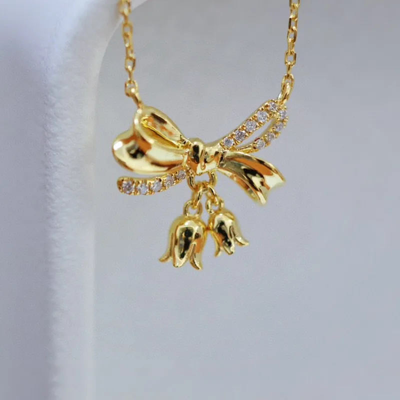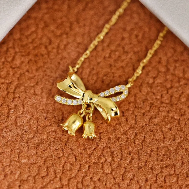 UBESTNICE Real 18K Solid Yellow Gold Jewelry AU750 Natural Diamonds Bow Lily of The Valley Flower Pendant Necklaces for Women