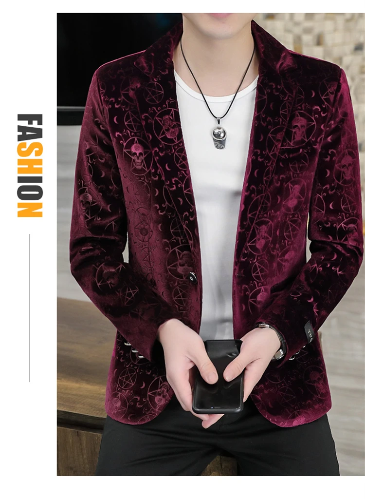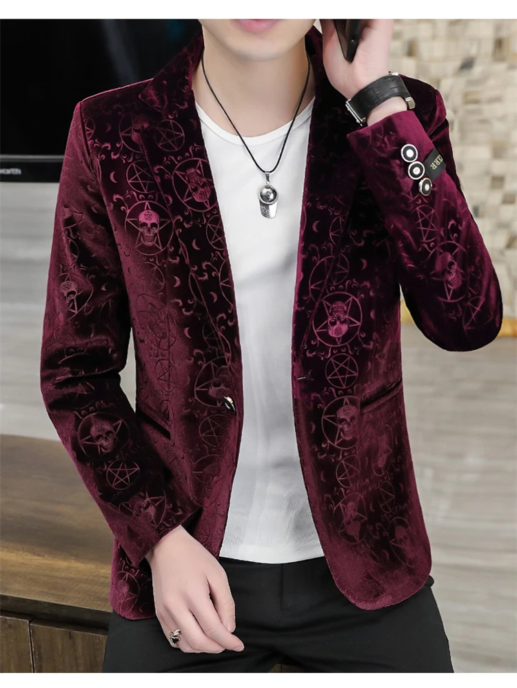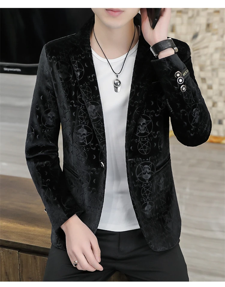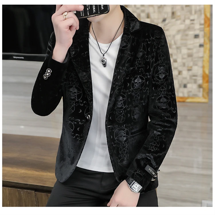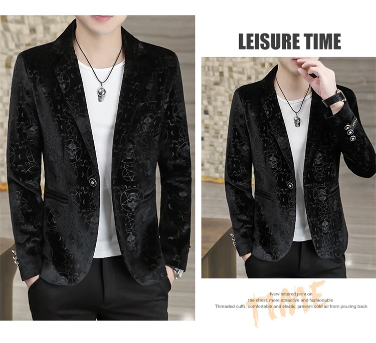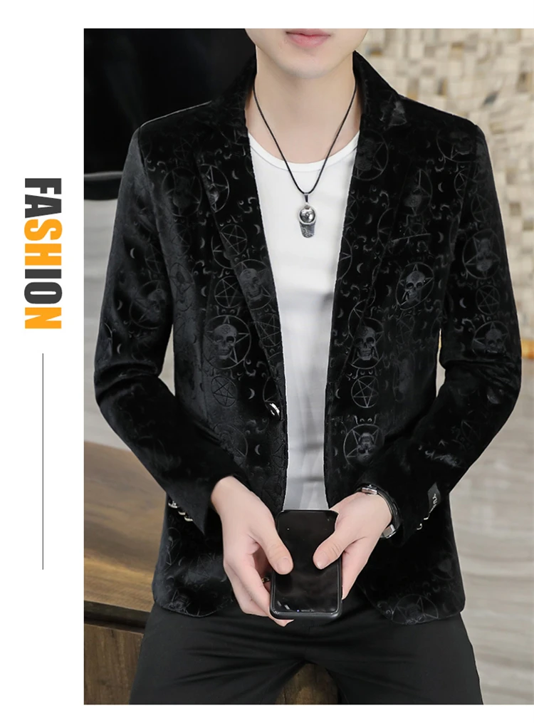Velvet Jacquard Luxury Blazers For Men Skulls Fashion Slim Fit Spring Quality Soft Comfortable Suits Coat Casual Terno Masculino