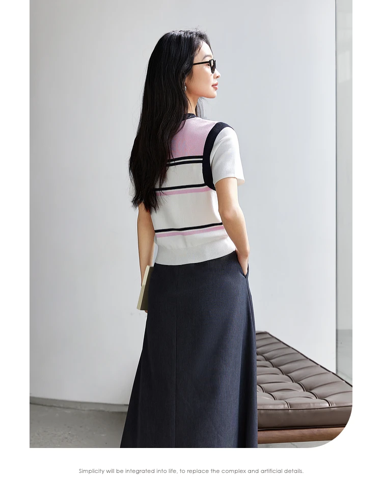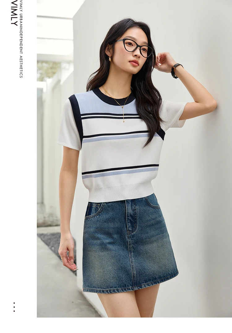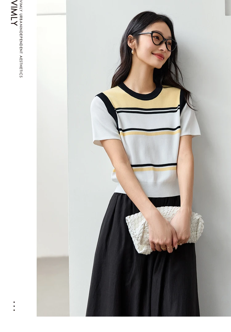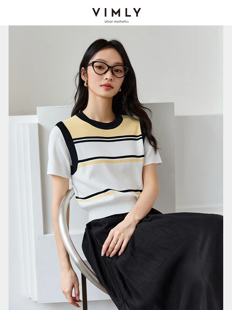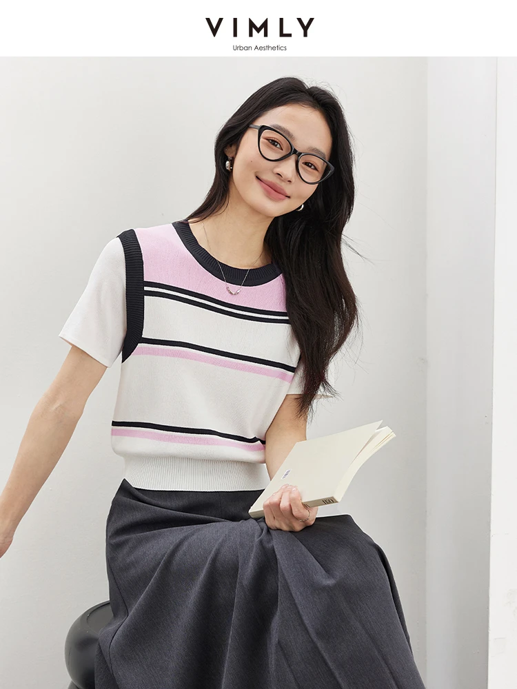 VIMLY Women Summer Knit Top 2025 Lady Knitwear Sweater Contrast Striped Short Sleeve Knitted T-shirt Woman Sweater Jumpers 73760