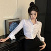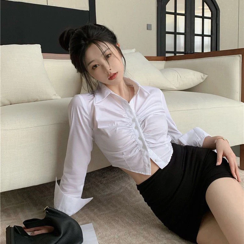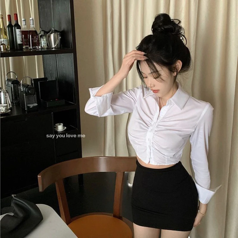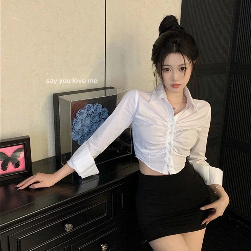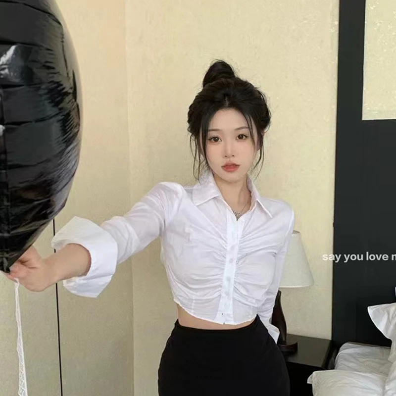 white sweet women shirts korean slim folds office long sleeve female casual blouse fashion new all match ladies crop tops