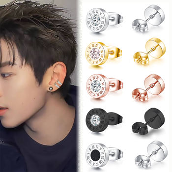 Black 316 Stainless Steel Round Shine AAAAA CZ 8MM Diameter Roman Numeral Stud Earrings For Men Women High Quality Brand Jewelry