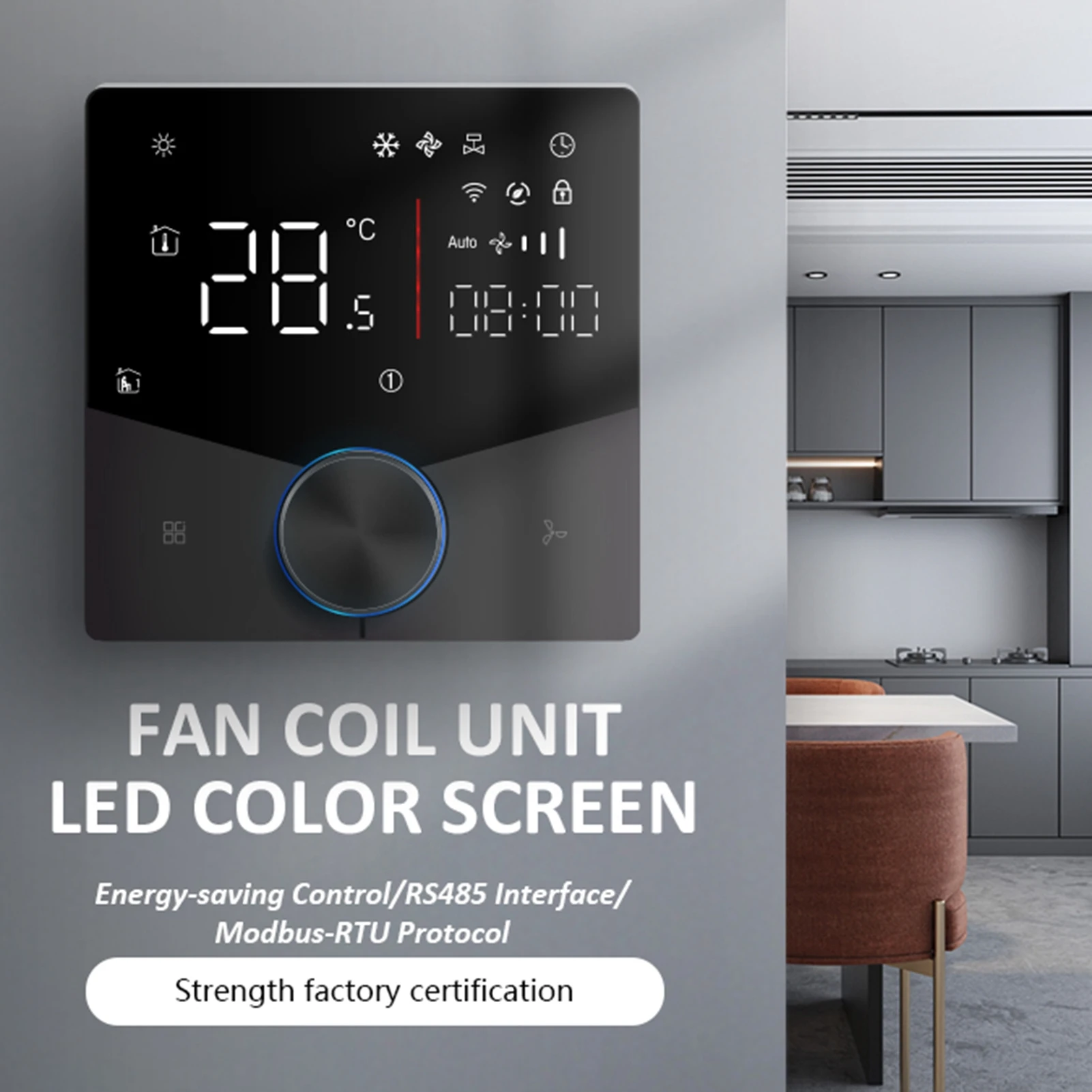 1. [Central AC Thermostat] This central air conditioning thermostat adopts LED panel, allowing for energy saving control, with 485 interface, supporting RTU protocol.