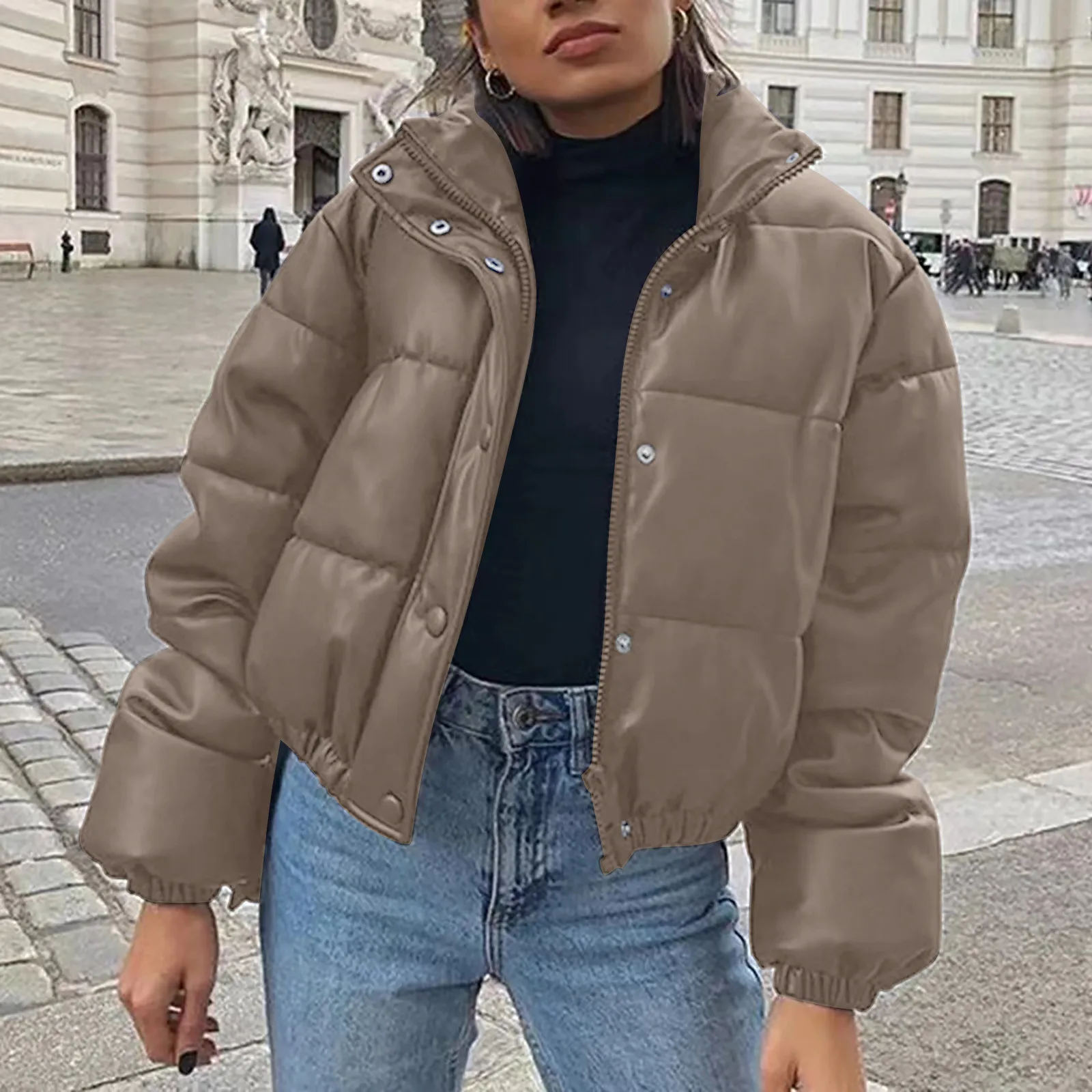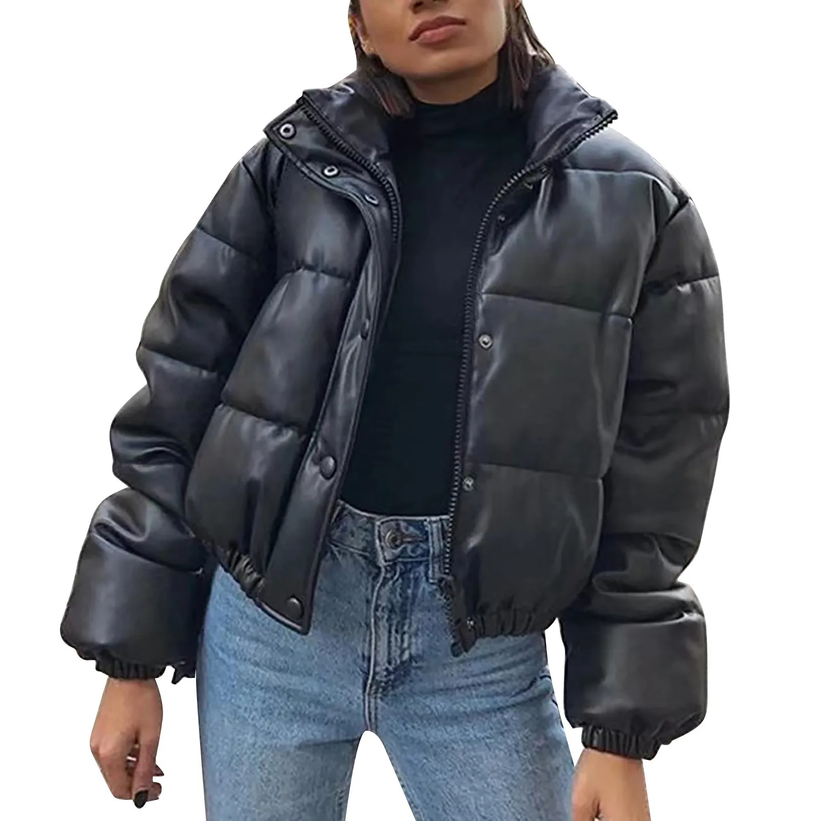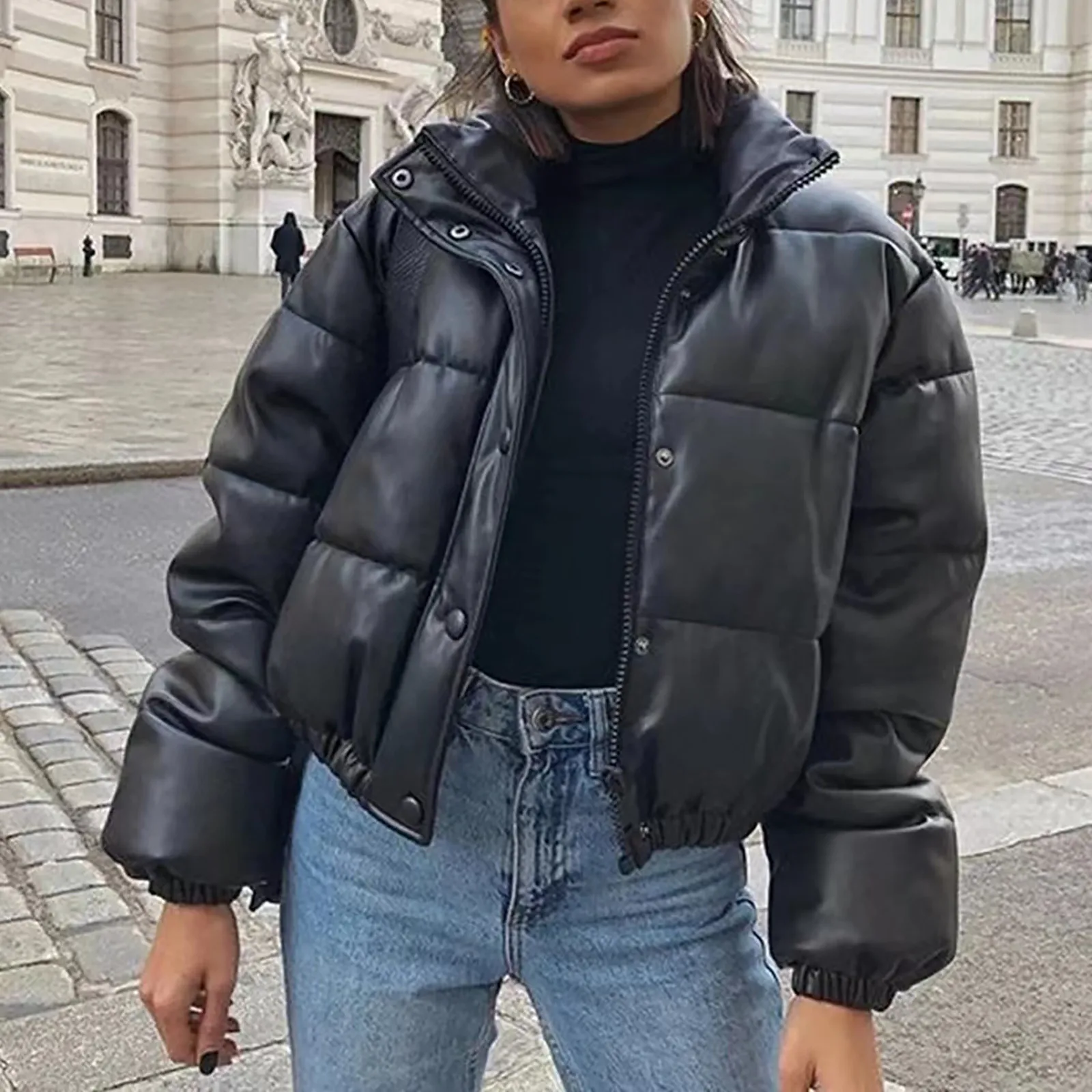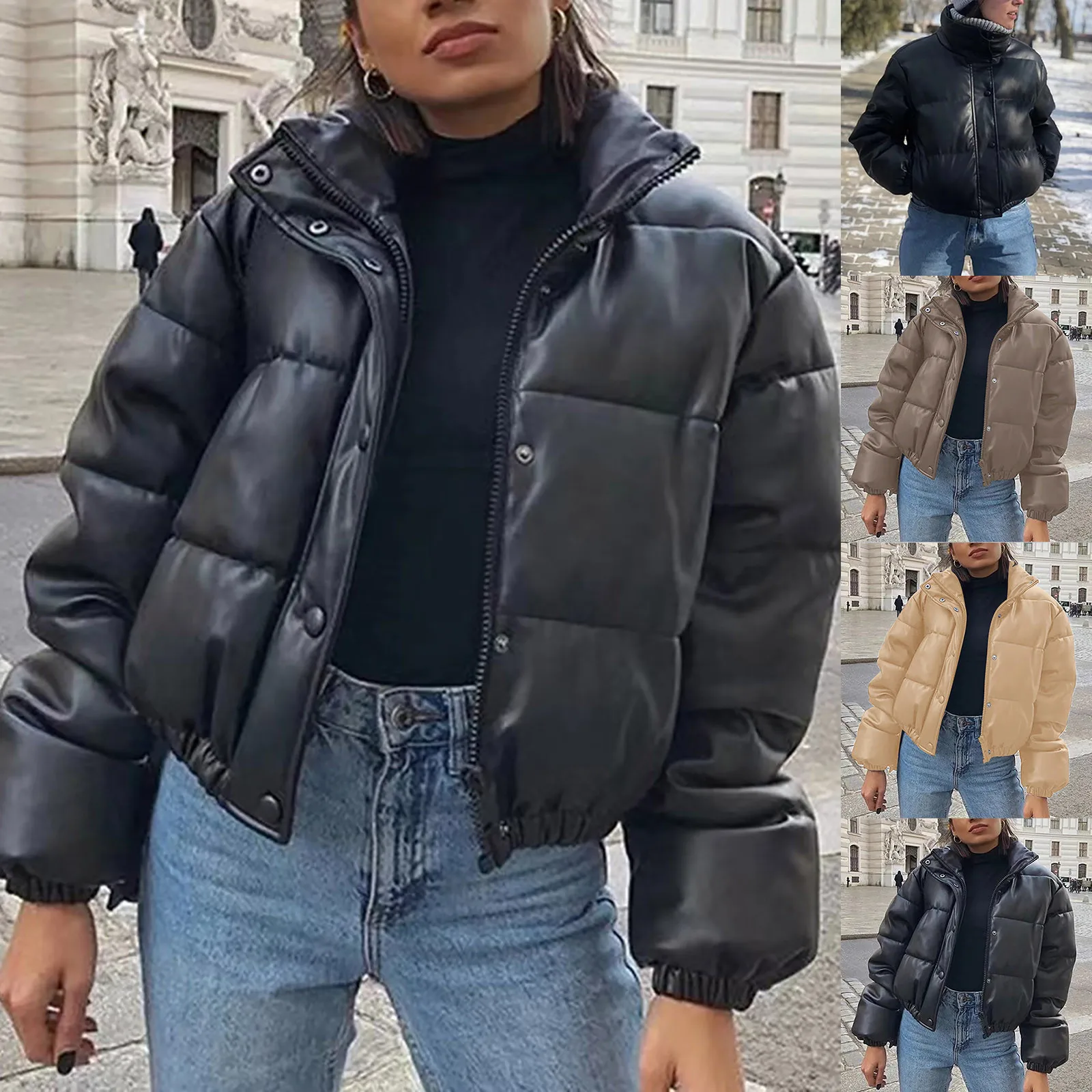 1. Women’s Winter Casual PU Leather Cotton Jacket with Stand Collar – Stay cozy and stylish this winter with our short-length, insulated coat. Made from high-quality PU leather and cotton, it provides excellent warmth and comfort.