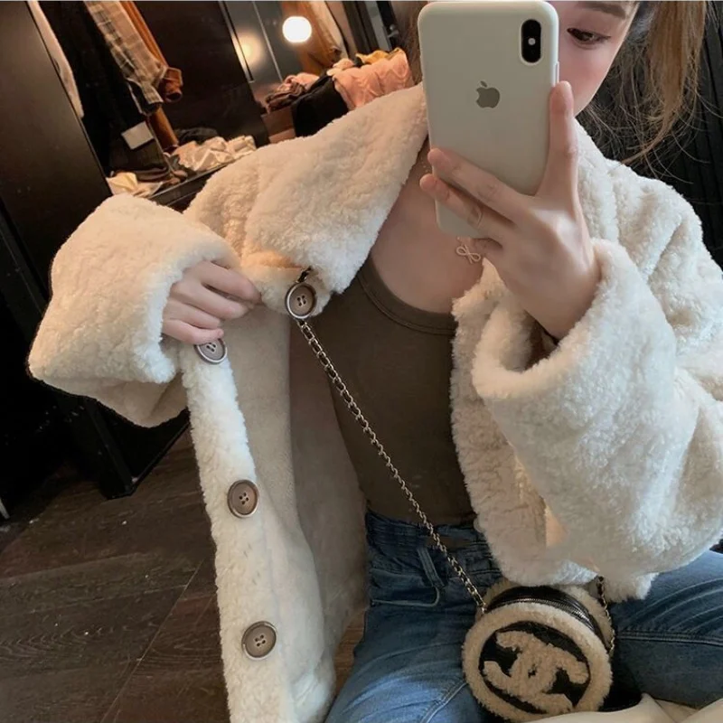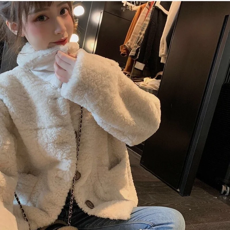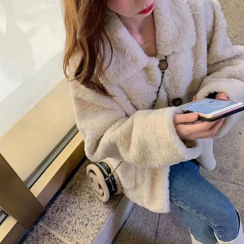 Women Autumn Winter Lamb Wool Faux Fur Thick Plush Warm Cardigan Button Overcoat Solid Loose Long-sleeved Casual Top Outerwear