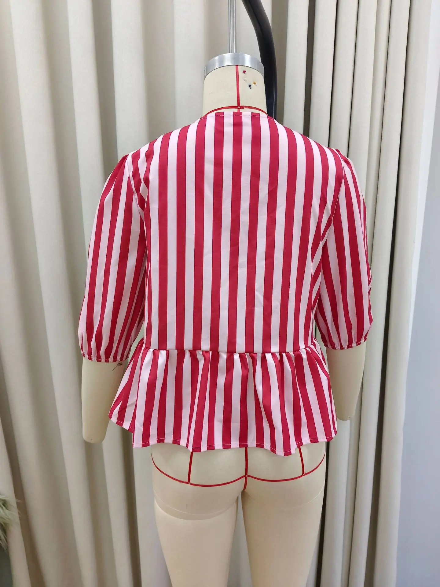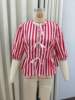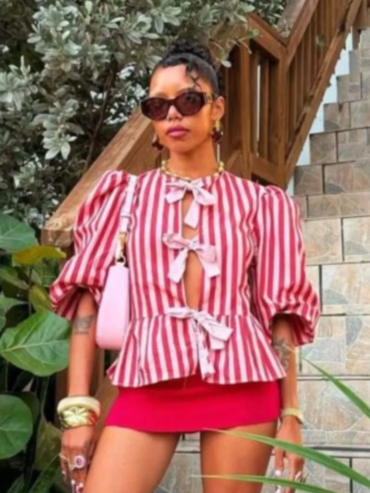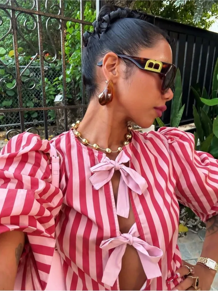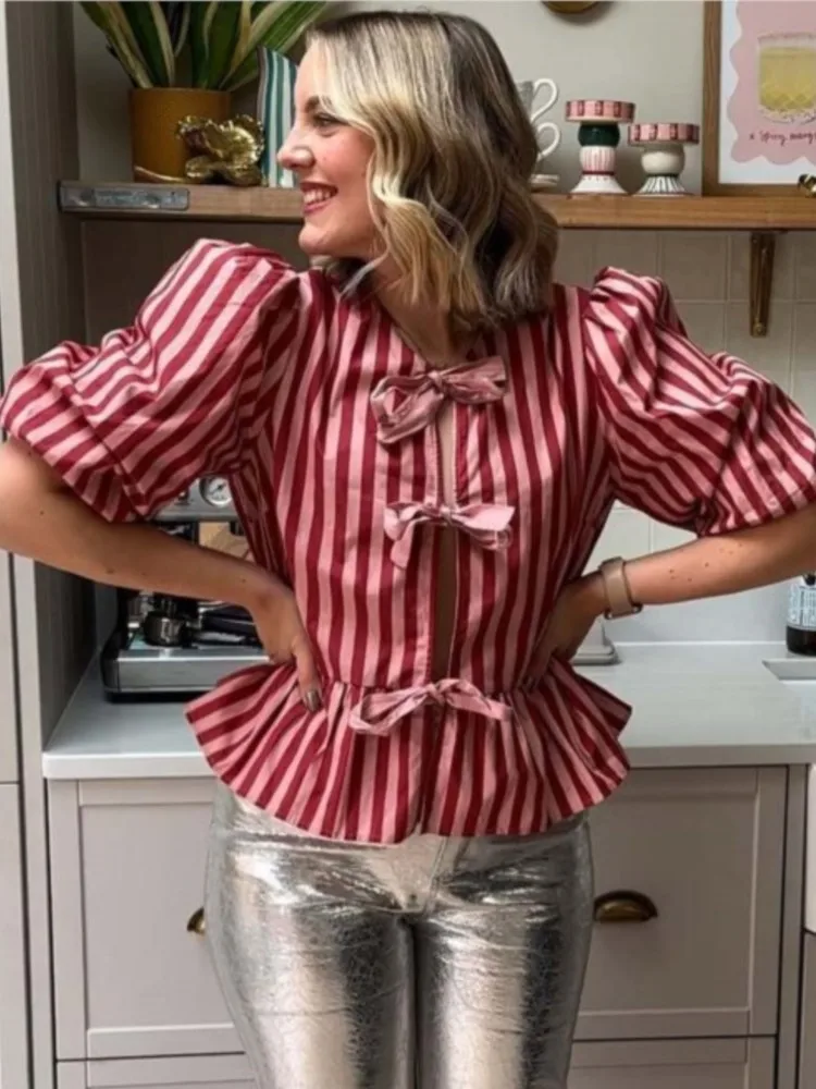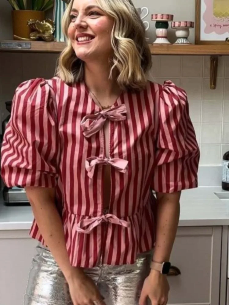 Women Fashion Puff Short Sleeve Lace-up Shirt Elegant Round Neck Pink Stripe Print Cropped Tops 2025 New High Street Lady Attire