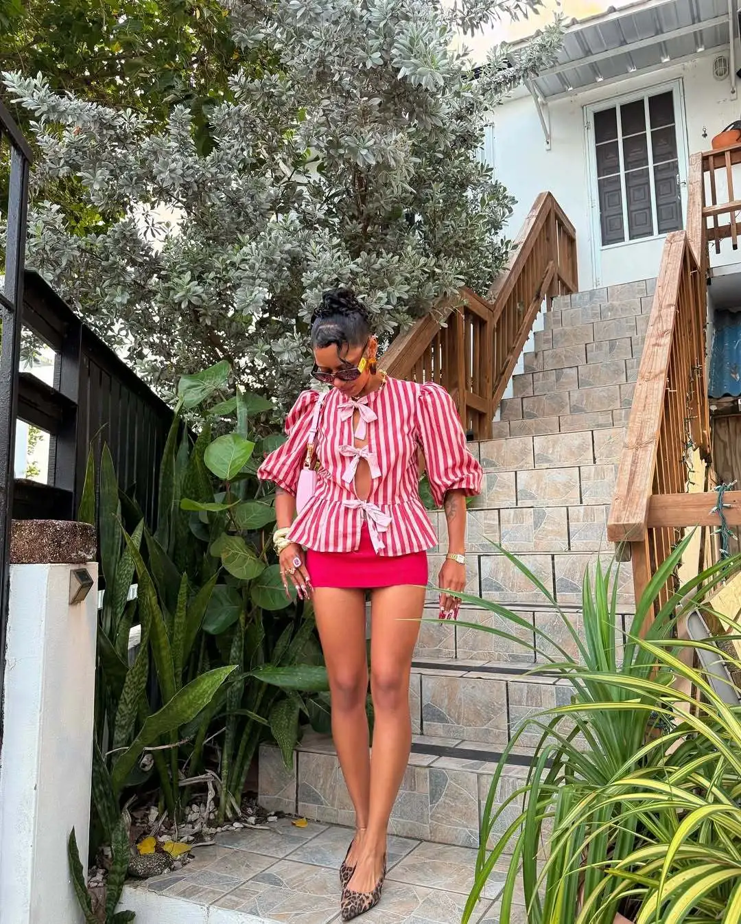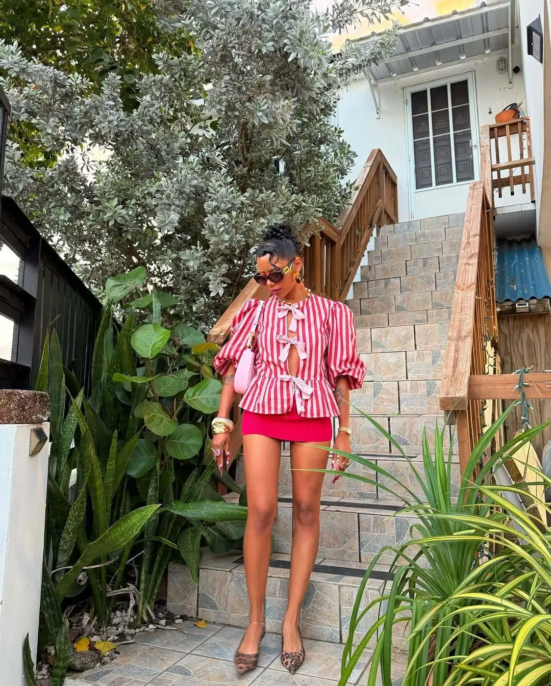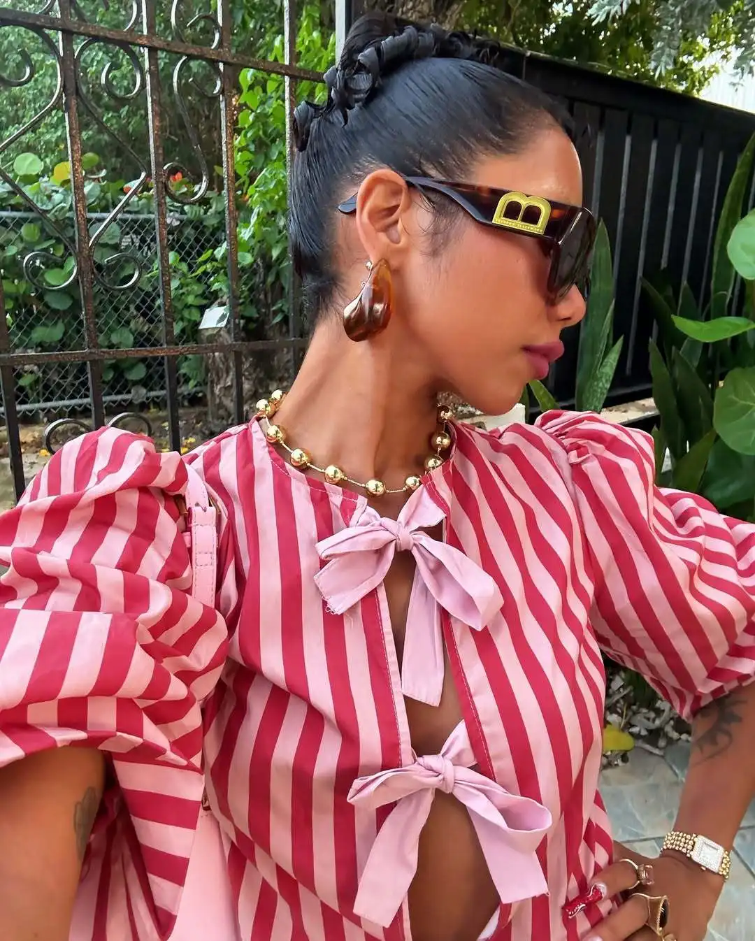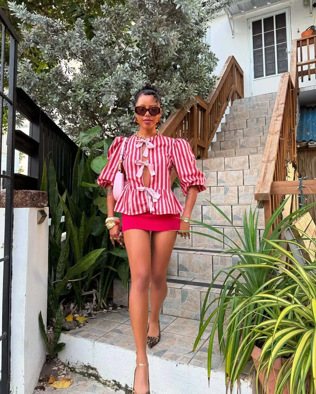 Women Fashion Puff Short Sleeve Lace-up Shirt Elegant Round Neck Pink Stripe Print Cropped Tops 2025 New High Street Lady Attire