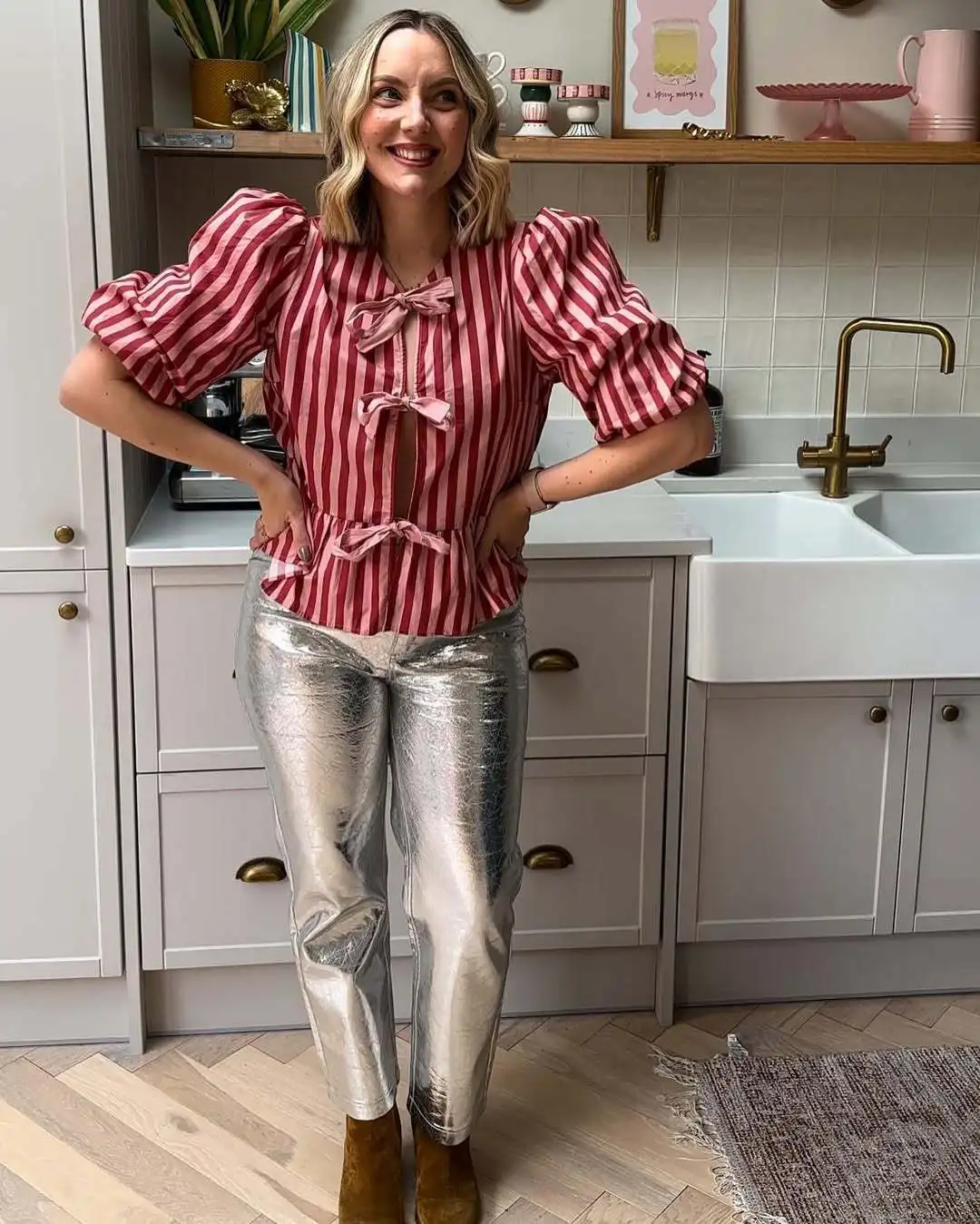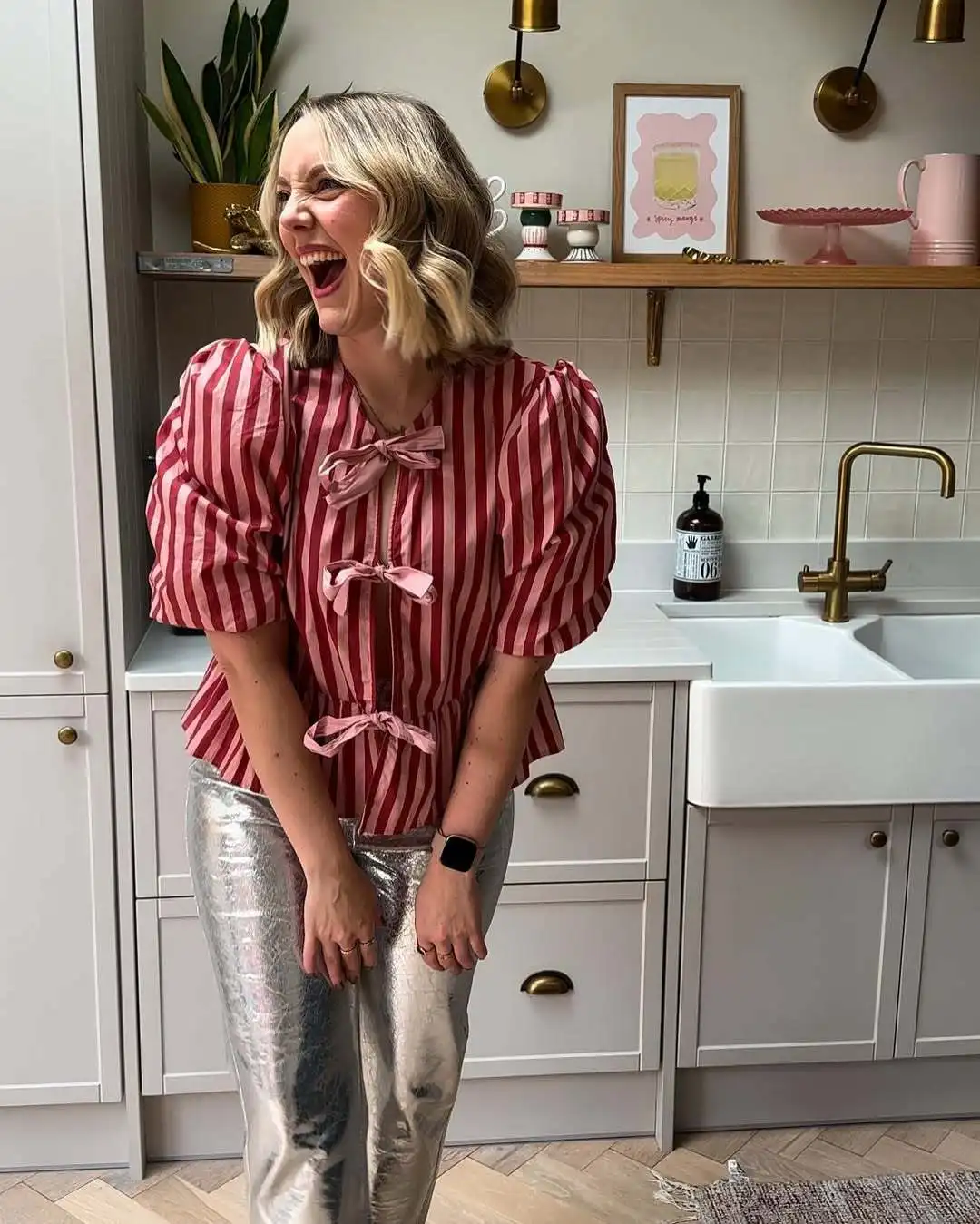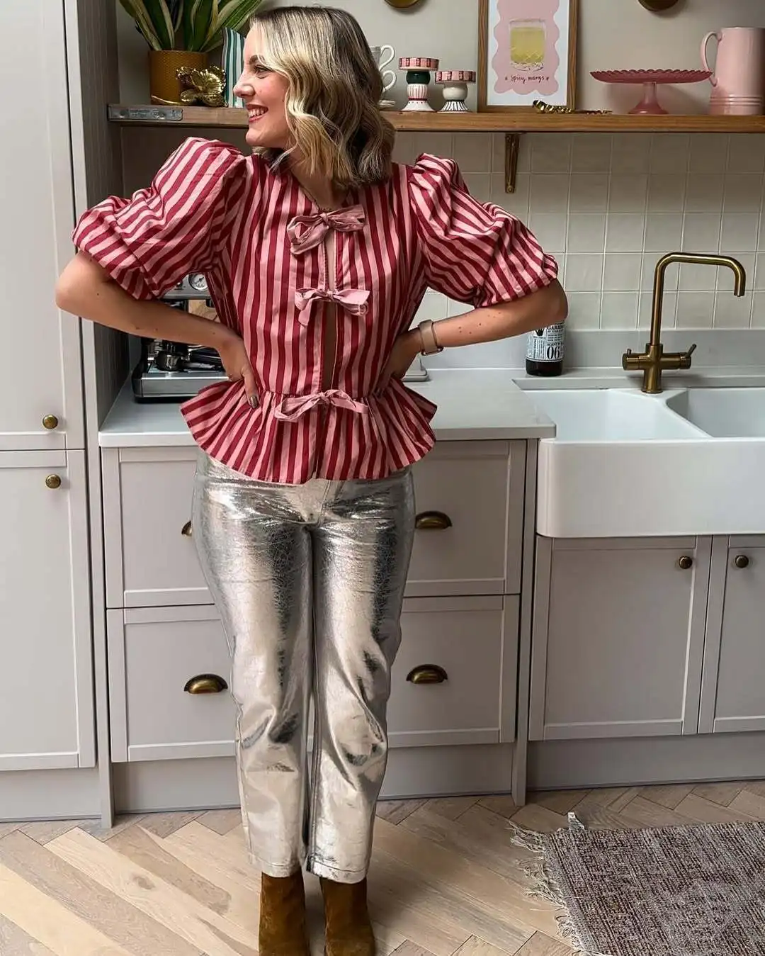Women Fashion Puff Short Sleeve Lace-up Shirt Elegant Round Neck Pink Stripe Print Cropped Tops 2025 New High Street Lady Attire