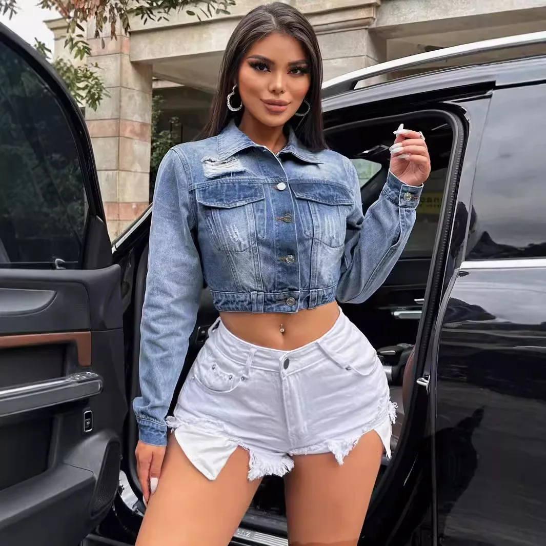 Women Hole Denim Jacket Vintage Pockets Single Breasted Turn Down Collar Short Coat 2024 Autumn Female Outerwear Streetwear
