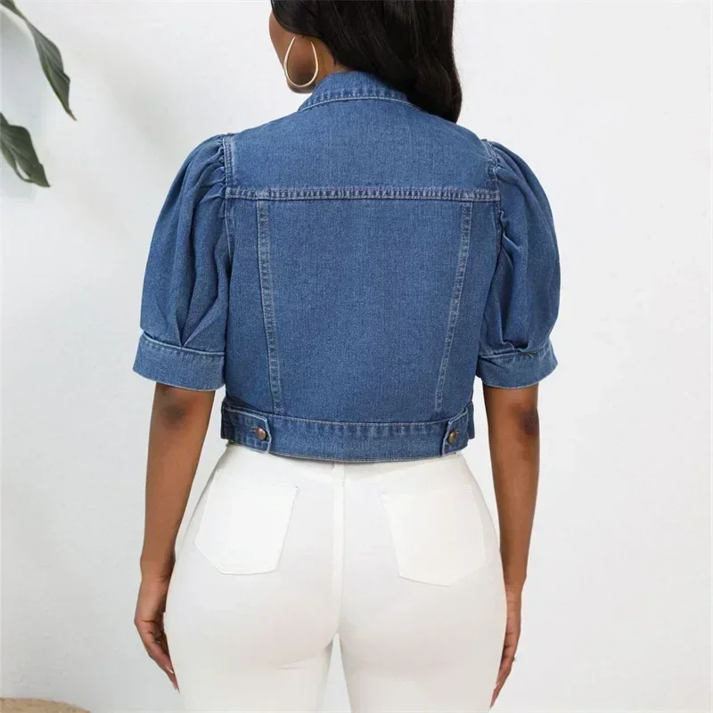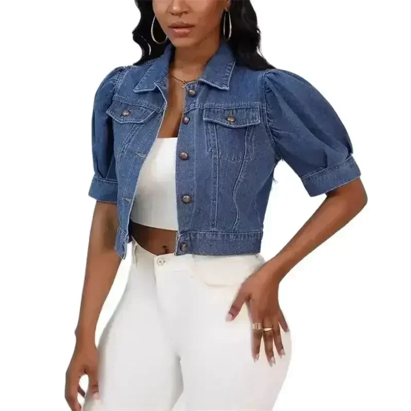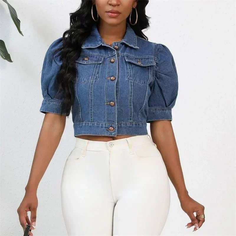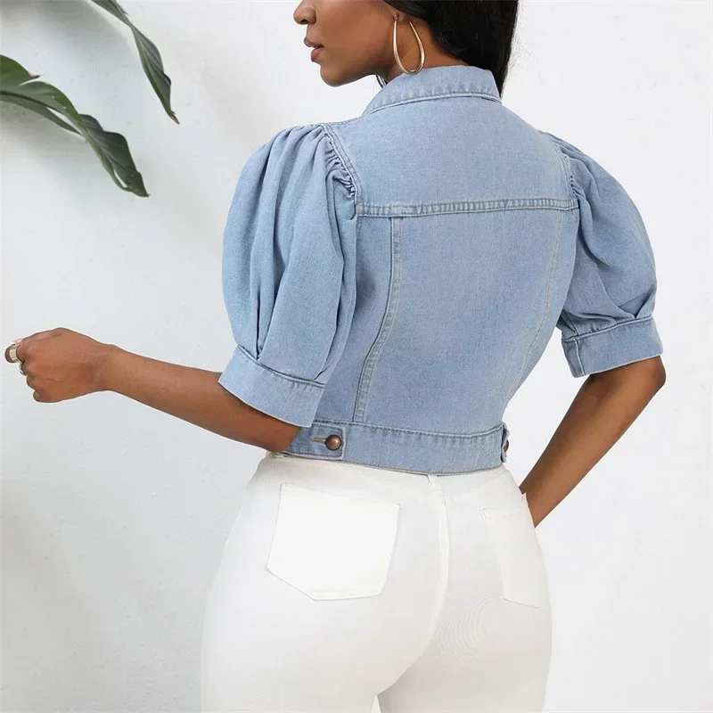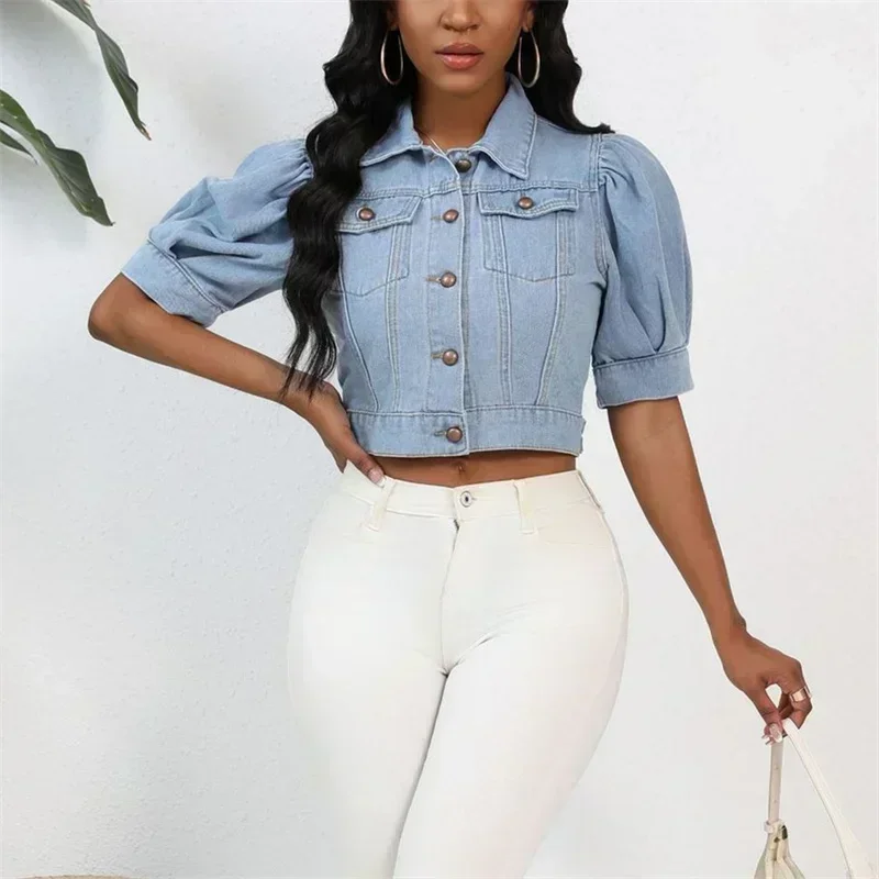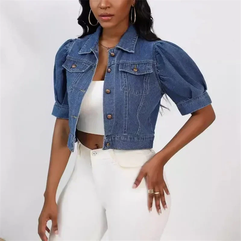 Women New Lapel Single Breasted Cardigan Denim Short Jacket Bubble Sleeve Outerwear Summer Casual Female Coat Stylish Streetwear