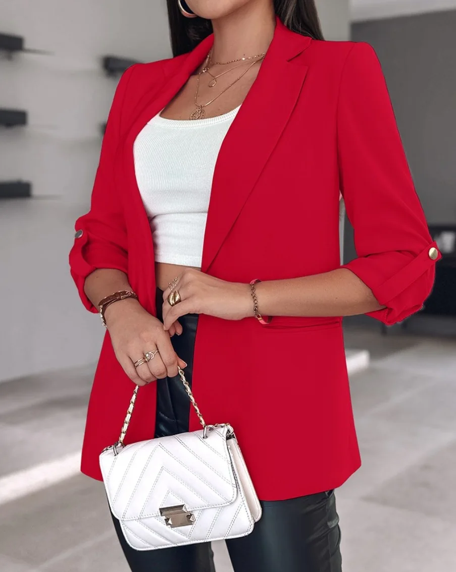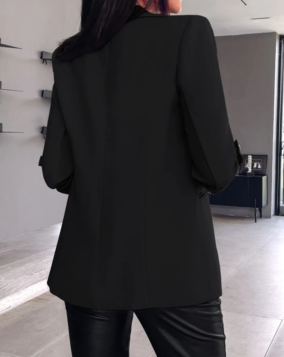 Women Notched Long Lantern Sleeve Slim Solid Business Pocket Cardigan Blazer Coats Outwear SZE-ST24137