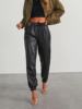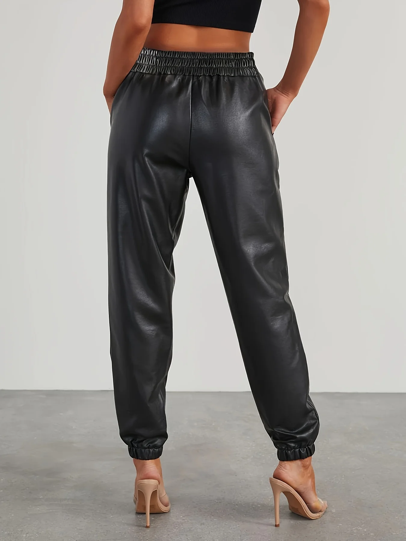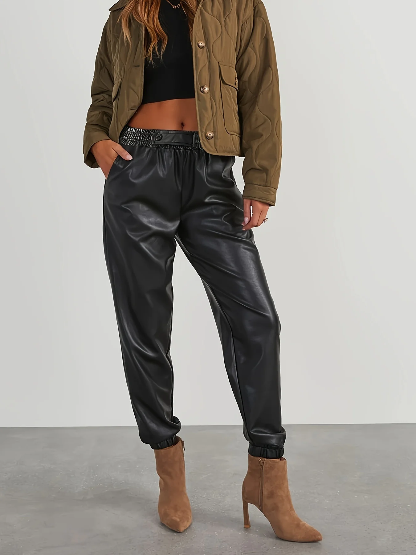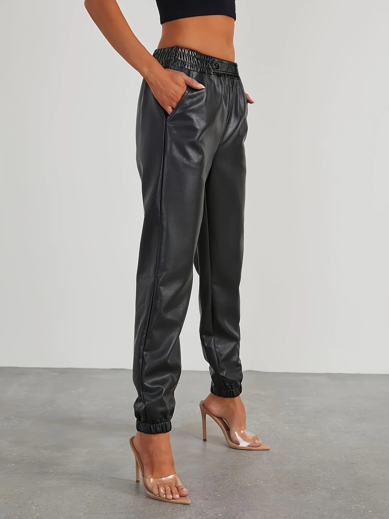 Women’s fashion PU leather elastic waist front loop single button casual sports pants women’s clothing women’s pants