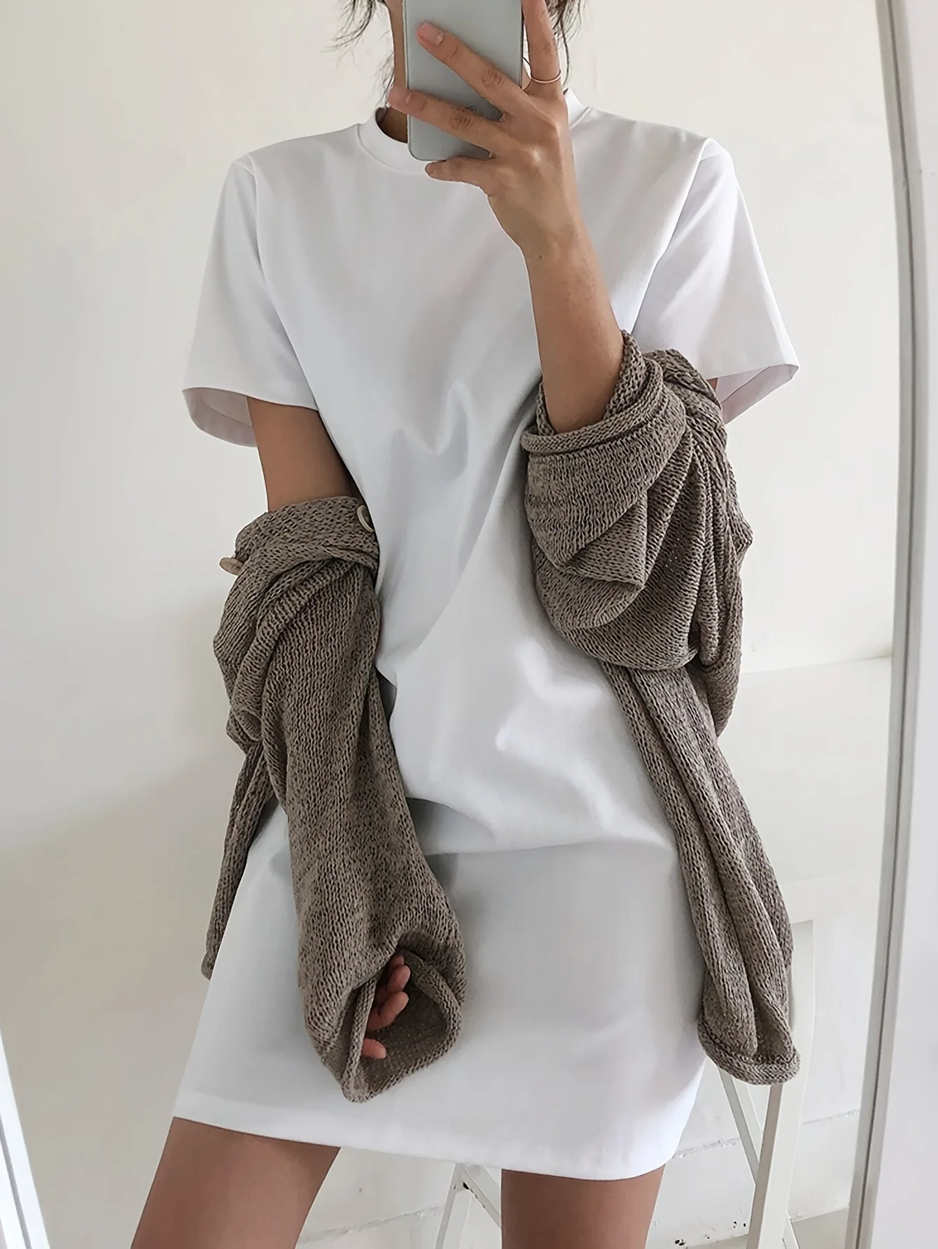 Women’s fashionable small round neck simple solid color loose T-shirt dress 2025