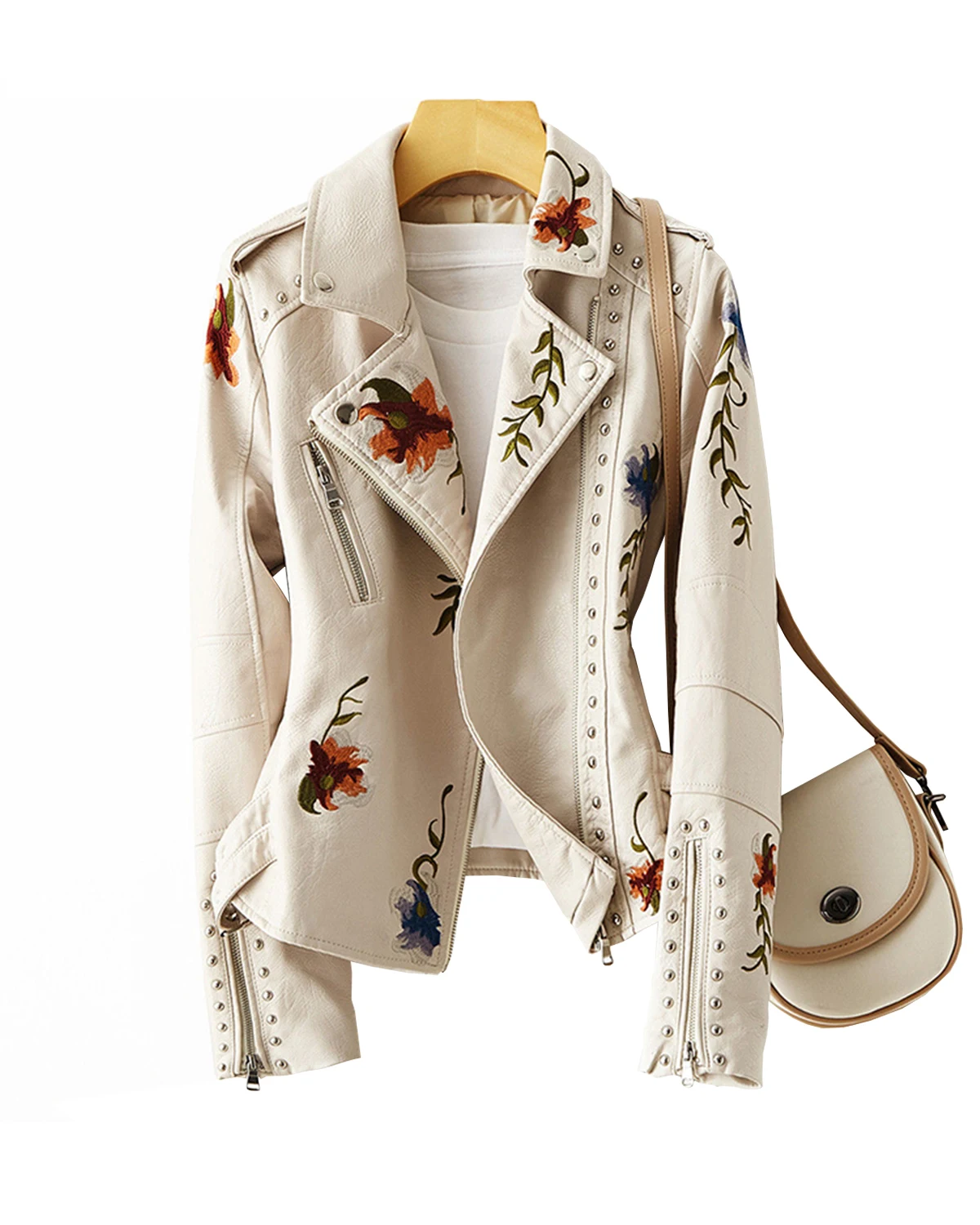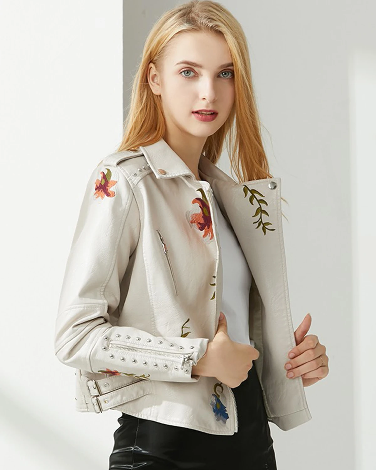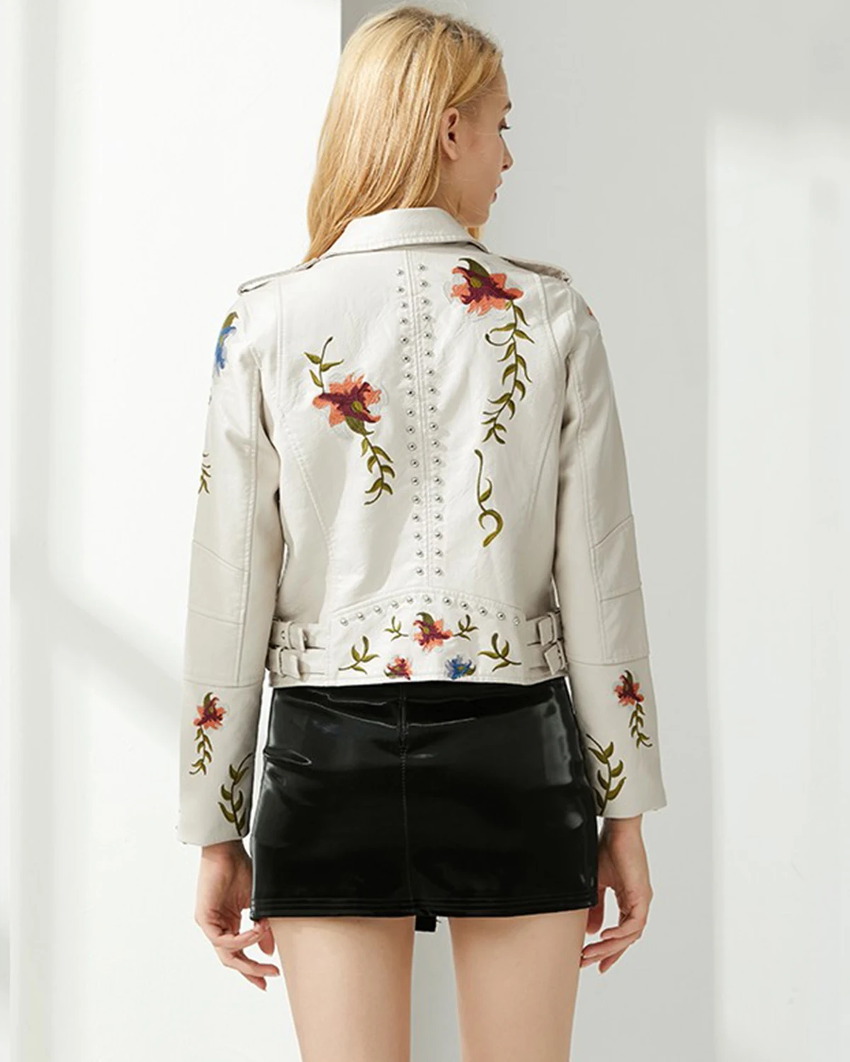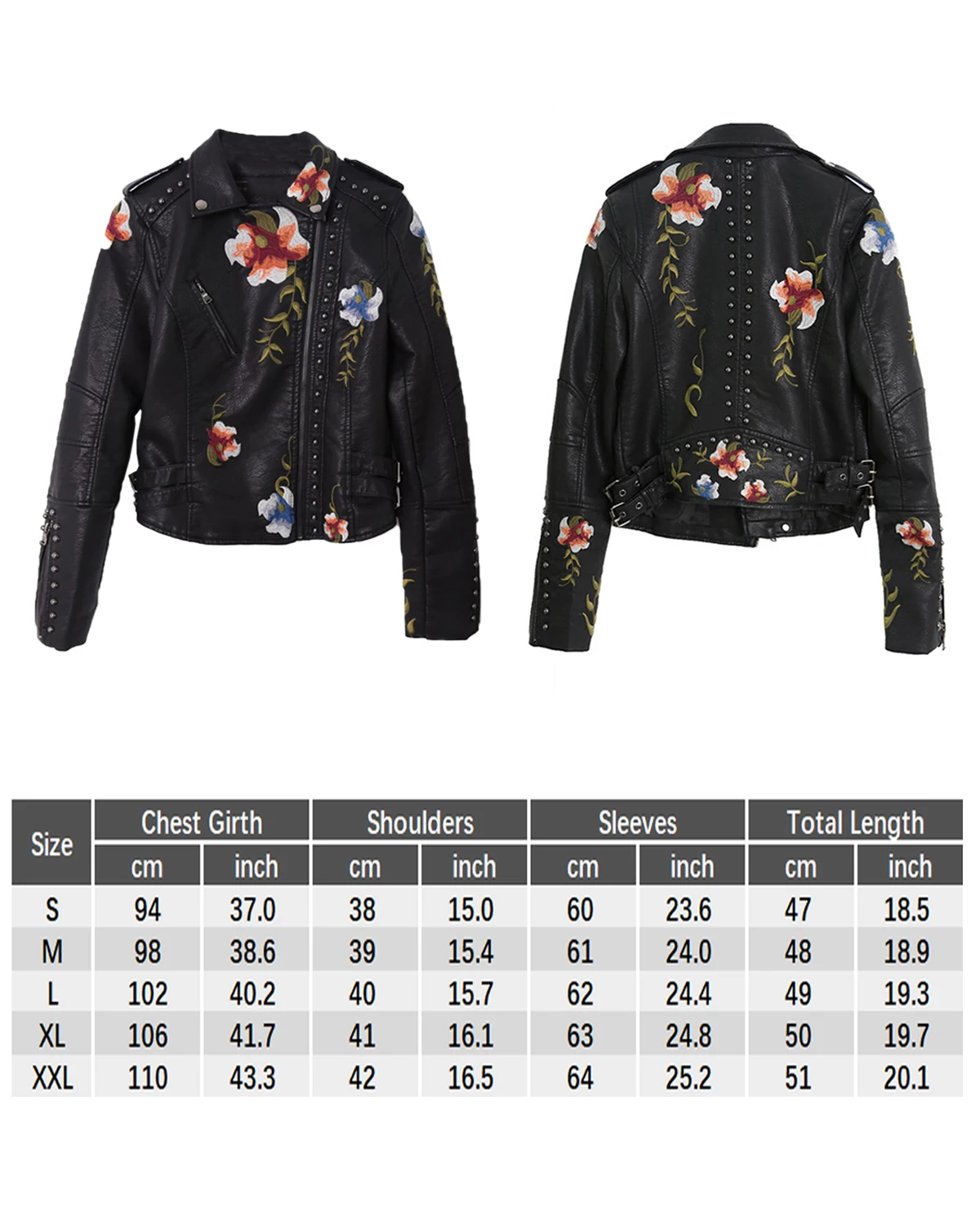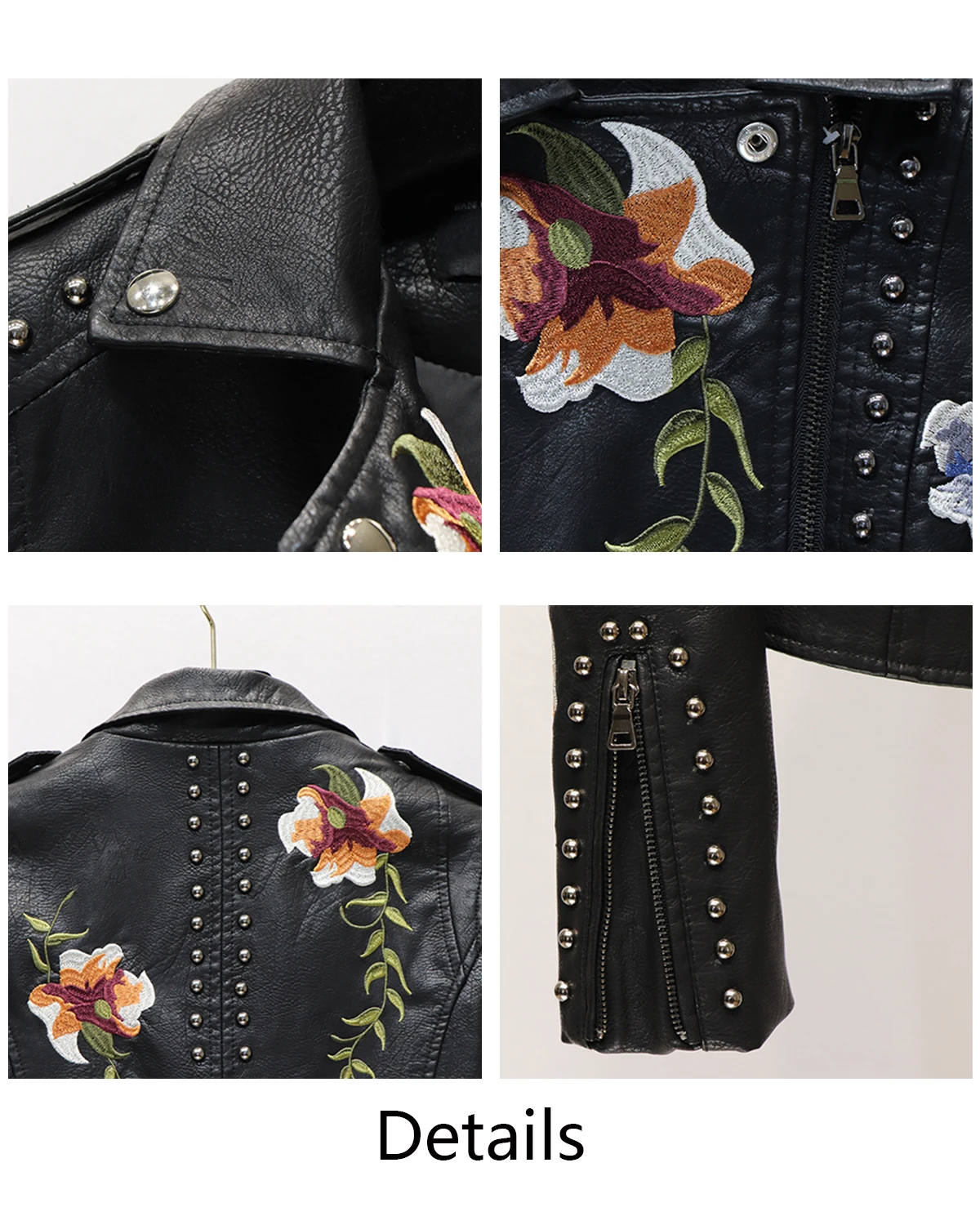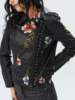 Women’s Floral Embroidered Faux Leather Moto PU Jacket Biker Bomber Coat