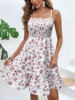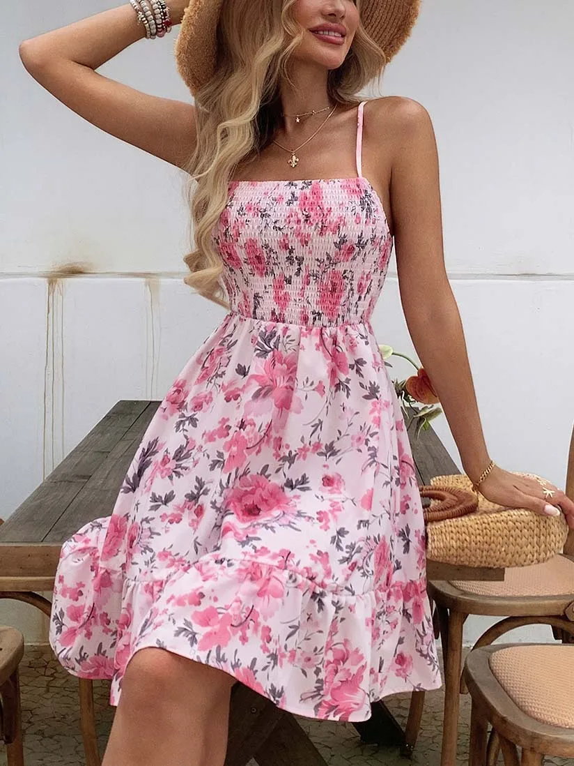 Women’s Floral Print Shirred Spaghetti Strap Dress – Summer Boho Ruffle Sundress Casual Beach Maxi Dress