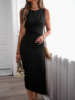 Women’s Plain Ruched Bow Back Plicated Split Bodycon Dress, Summer Elegant Sleeveless Round Neck Midi Dress
