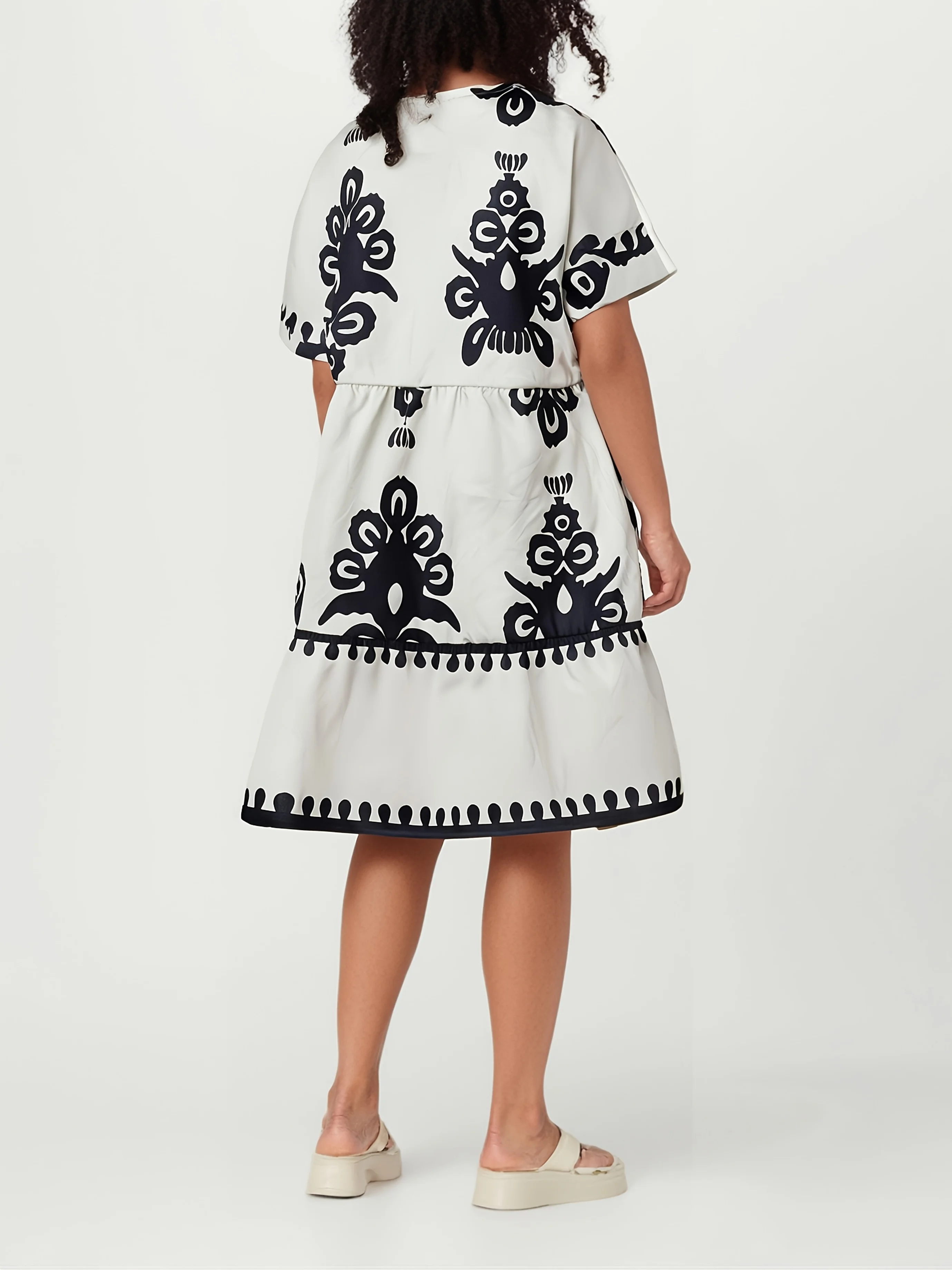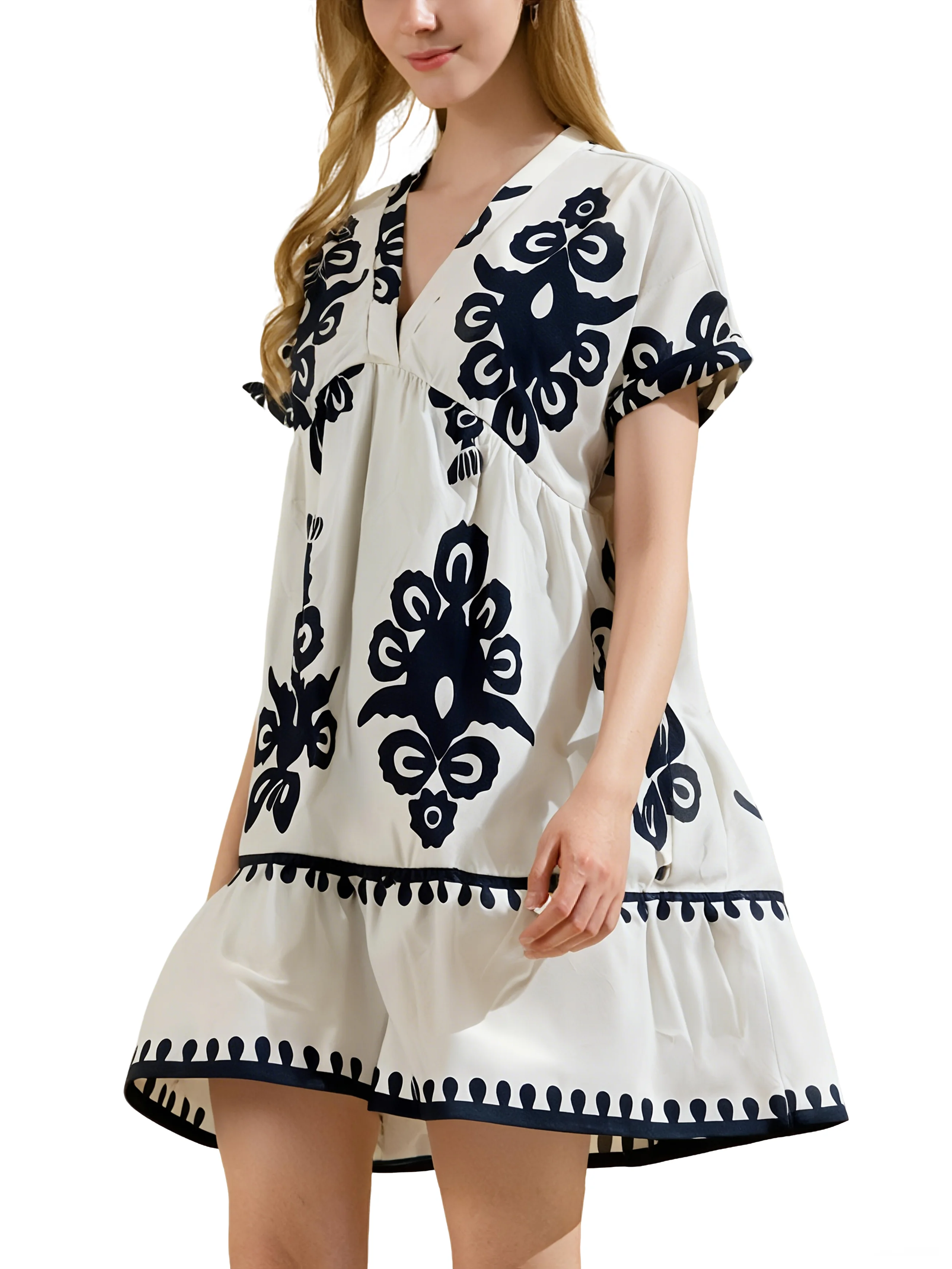 Women’s V-Neck Short Sleeve Blue & White Ethnic-Inspired Floral Print Relaxed Fit Tiered Ruffled Hem Boho Summer Mini Dress
