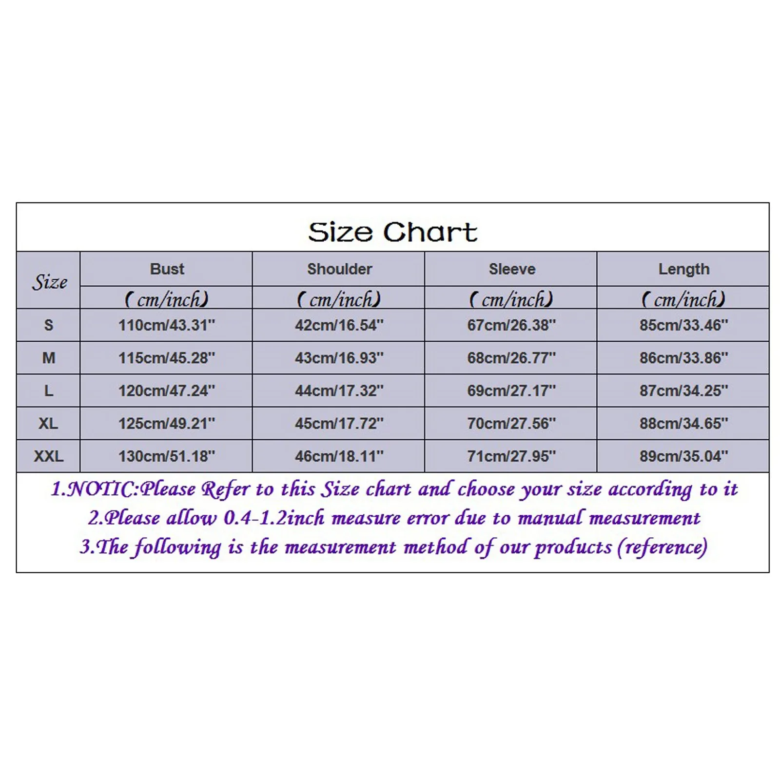 | Size:XL | Bust:125cm/49.21” | Shoulder:45cm/17.72” | Sleeve:70cm/27.56” | Length:88cm/34.65” |
